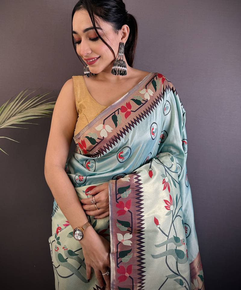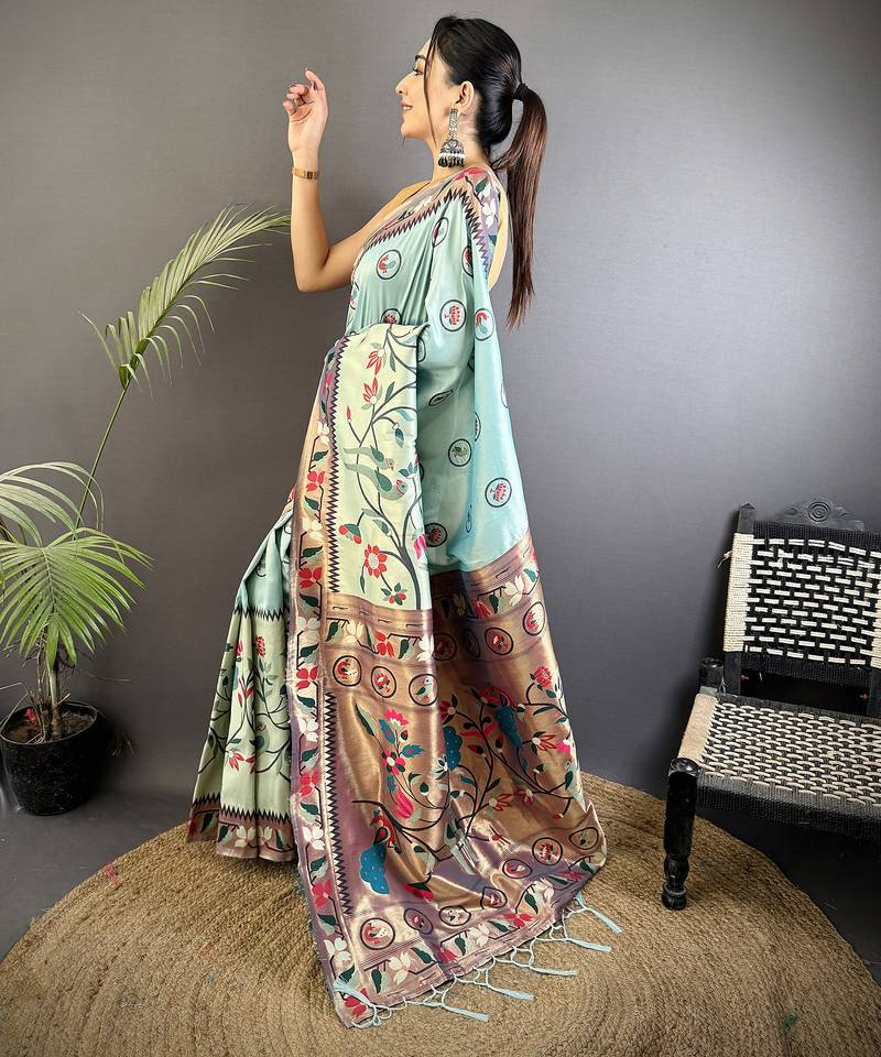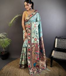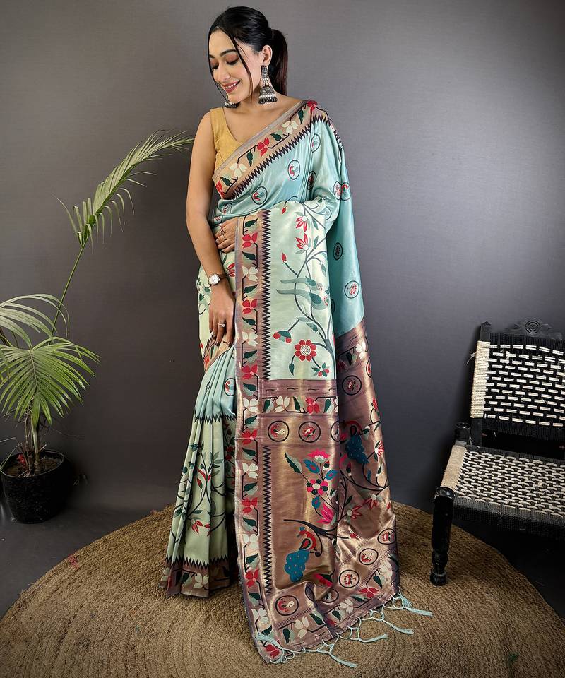 Turquoise blue soft silk blend paithani meenakari zari weaving saree