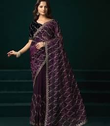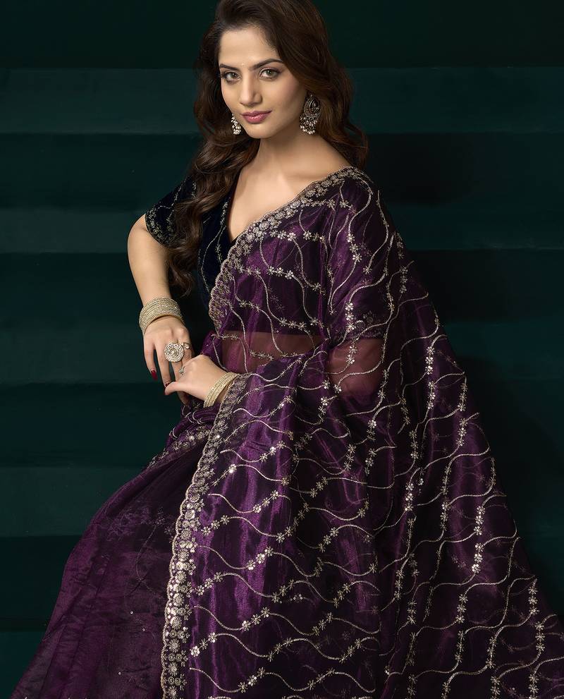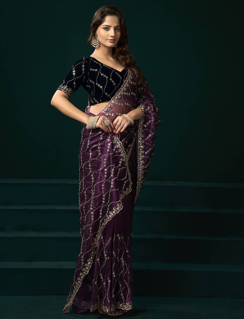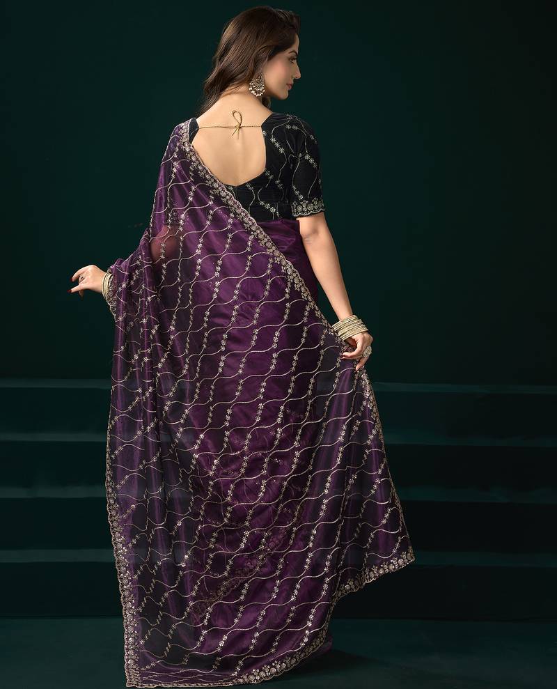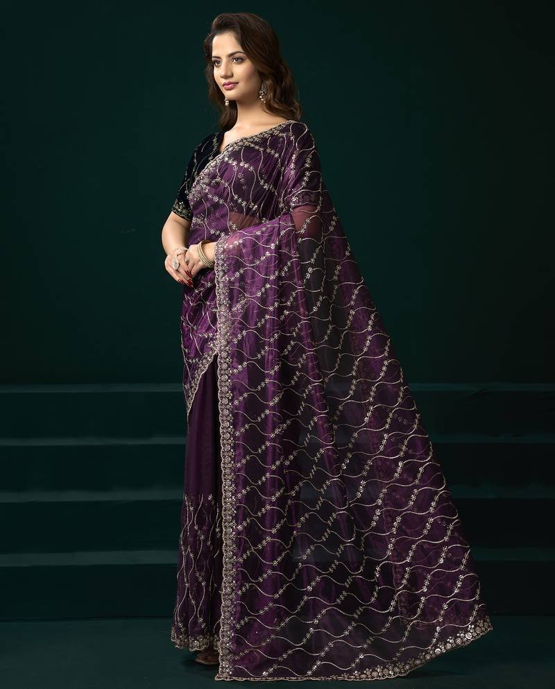 Wine net jaal pattern sequence embroidery thread work party wear saree