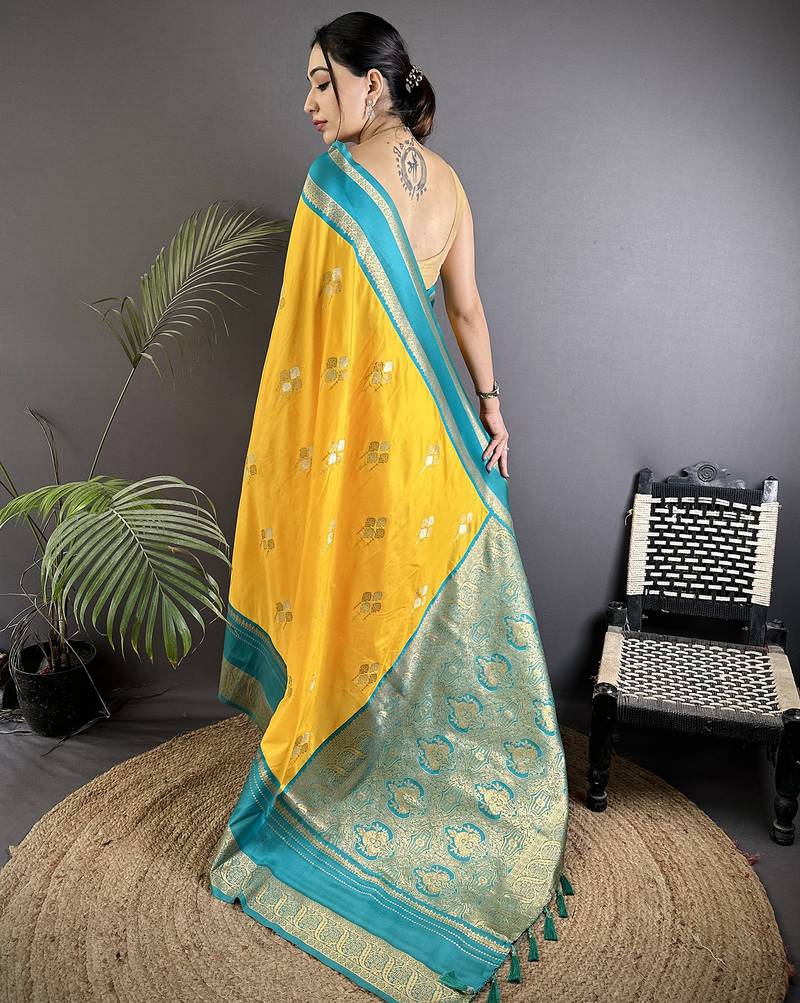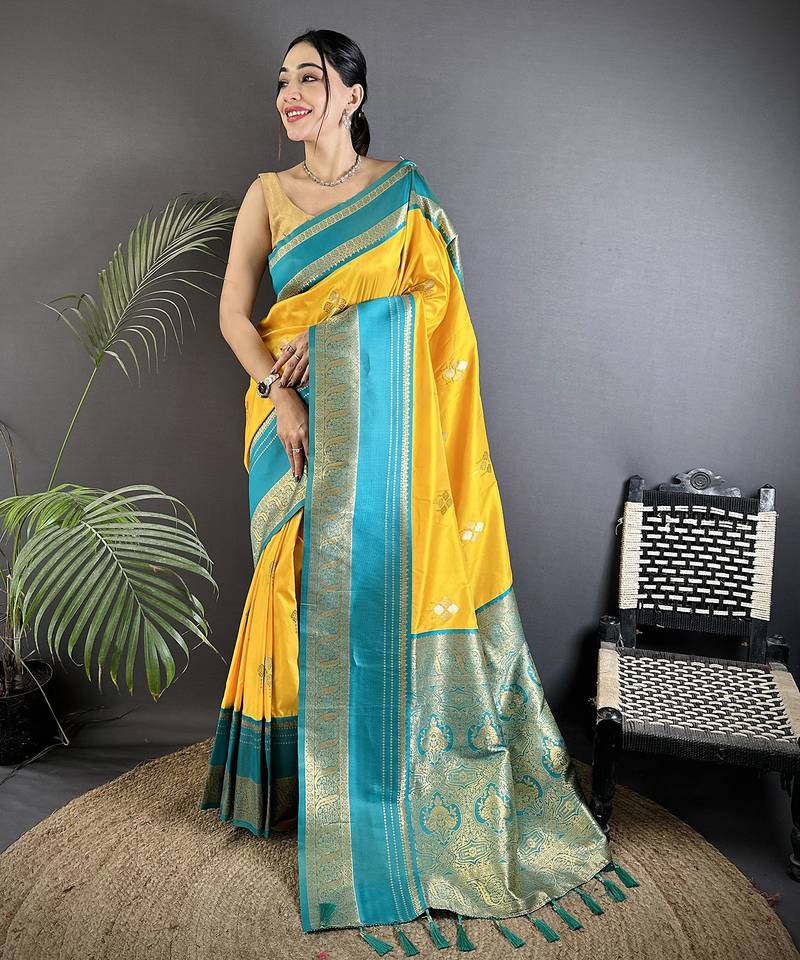 | Product Name | Yellow Soft Silk Blend Woven Dual Zari Work Banarasi Saree | |