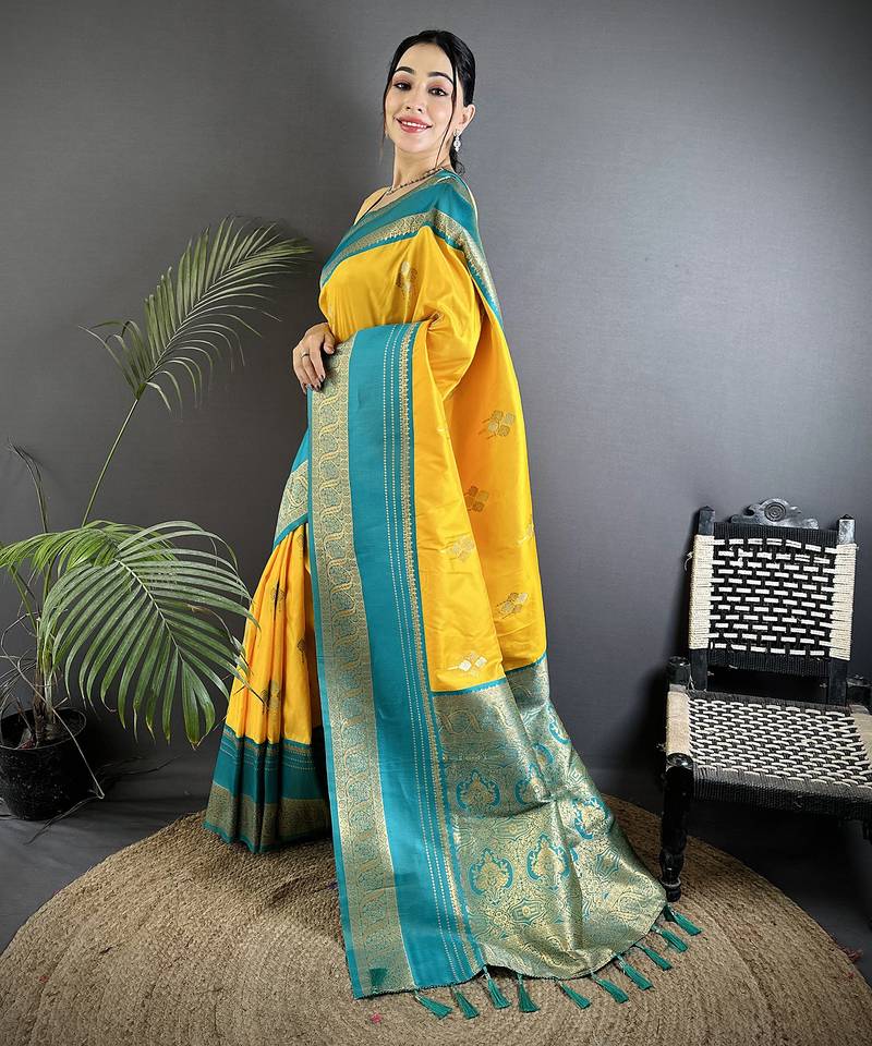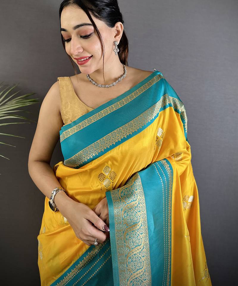 | Product Description | Brighten Every Celebration With The Yellow Soft Silk Woven Dual Zari Work Banarasi Saree, Crafted For Women Who Love Trending, Top Ranking, And Most Popular Ethnic Styles On Mirraw. The Vibrant Yellow Shade Brings A Joyful, Festive Glow That Instantly Lifts Your Look, While The Soft Silk Drape Keeps You Feeling Light, Elegant, And Effortlessly Stylish. Perfect For Weddings, Pujas, Festive Parties, And Cheerful Gatherings, This Saree Is Designed To Make You Stand Out With Ease.