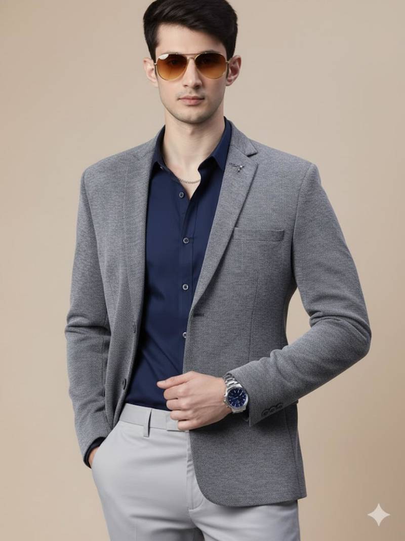 Product Name | Men's Grey Single Breasted Regular Fit Blazer In Premium Knitted Fabric With Lapel Pin | |