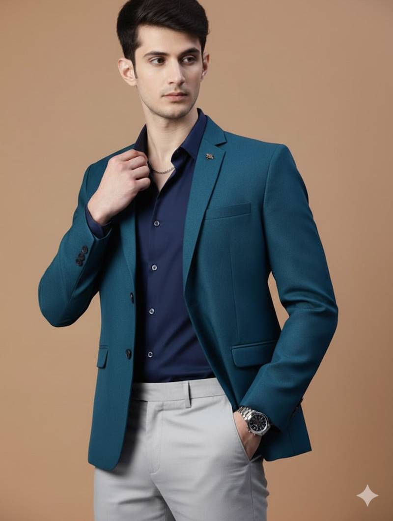 Product Description | Add A Sophisticated Pop Of Color To Your Wardrobe With This Deep Sea Blue Single Breasted Regular Fit Blazer. Featuring A Classic Two Button Closure And A Notched Lapel, This Blazer Offers A Refined And Tailored Silhouette. With Long Sleeves, Two Flap Pockets, And One Chest Welt Pocket, It Provides Both Style And Functionality. The Included Lapel Pin Adds A Touch Of Elegance, Making This Blazer Perfect For Formal Events, Business Meetings, Or Stylish Evenings. A Versatile And Timeless Addition To Any Modern Gentleman’s Wardrobe. |