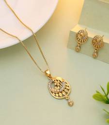 | Product Description | Chain Length: 42.00 Cm | Pendant Length: 3.50 Cm X Width: 1.80 Cm | Earring Length: 2.20 Cm X Width: 1.10 Cm | Metal: Alloy With Good Quality Gold Plated | Color: Gold | Stone: Rhinestone | Gross Weight: 25.00 Grams | Package Content: 1 Piece Of Pendant/ 1 Pair Of Earring | Back Finding: Post With Friction Back X Earring Style: Drop |