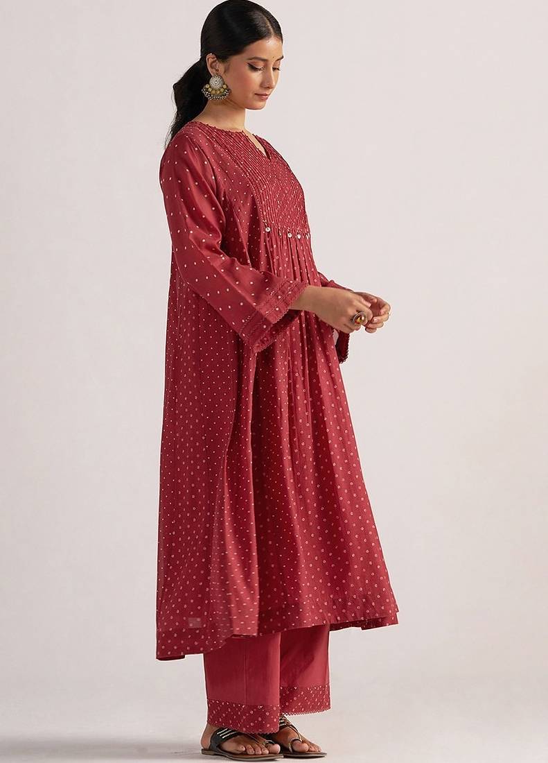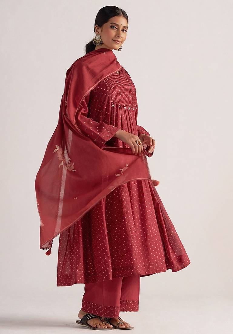 Product Name Garnet Red Bandhani Print Mul Chanderi Kurta Set
