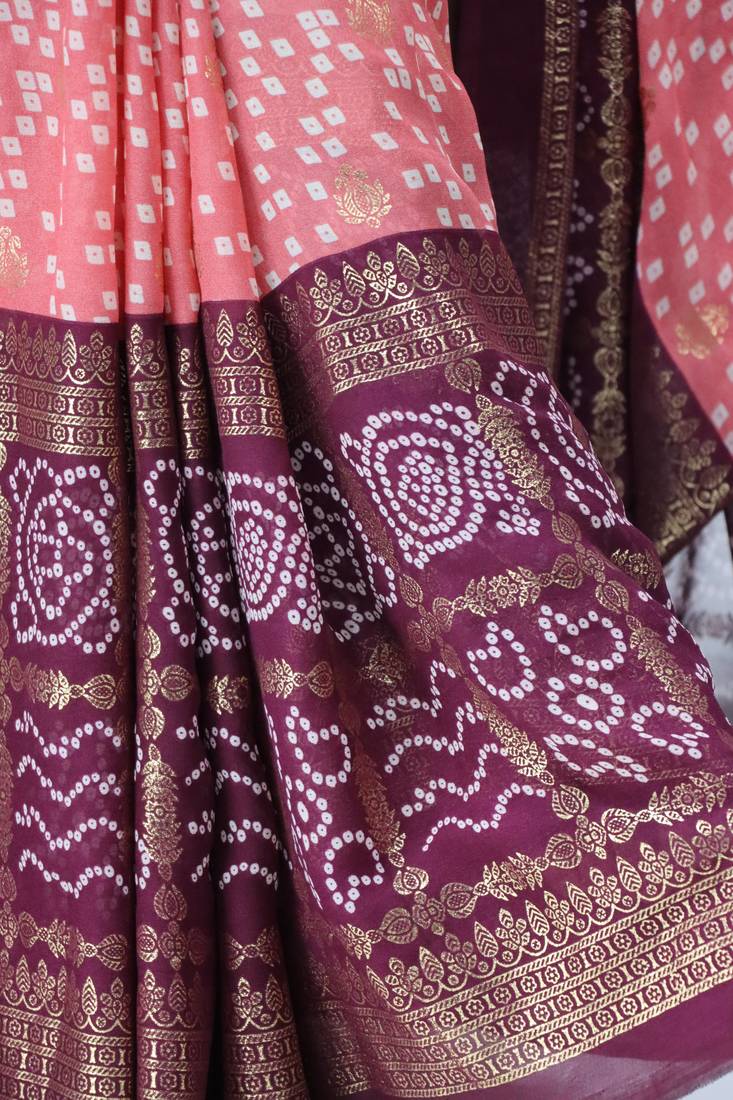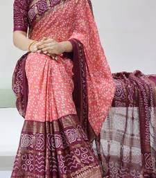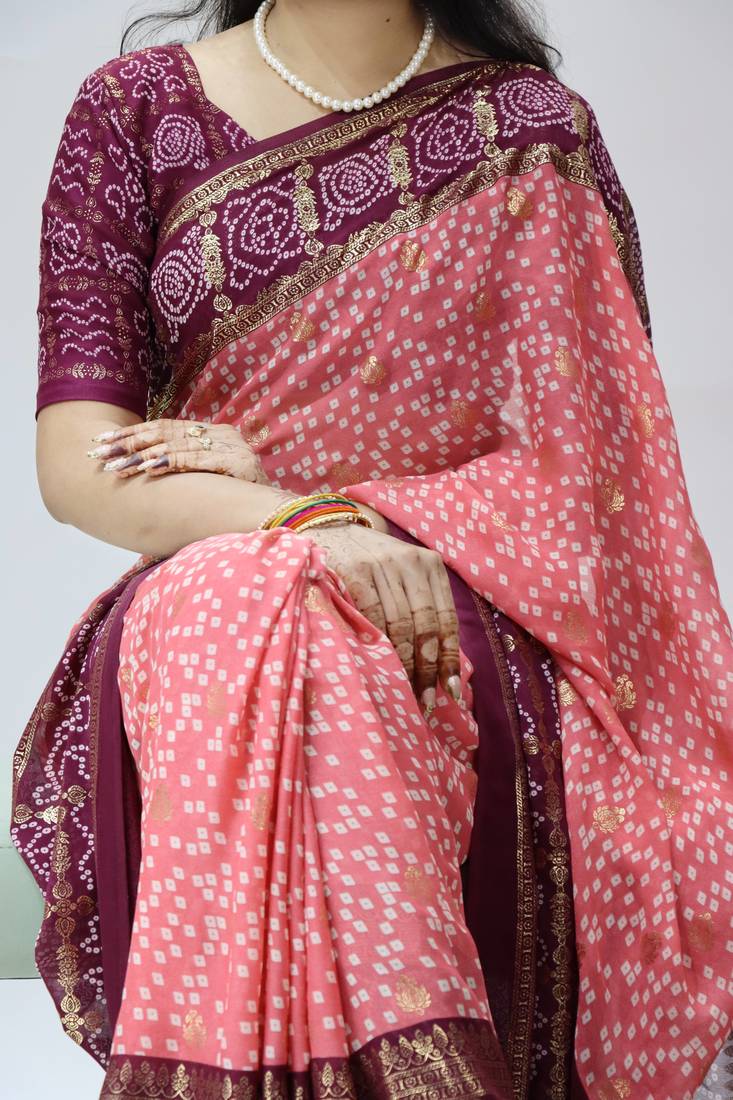 Pink color bandhni printed with foil work moss art silk saree with unstitched blouse