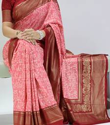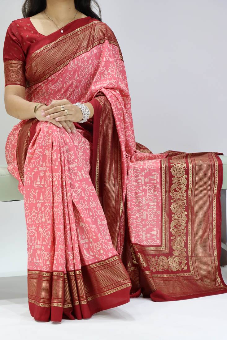 Pink color printed with foil work and contrast border soft tussar silk saree with unstitched blouse