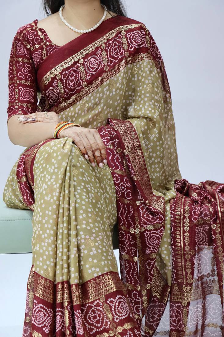 yellow color bandhni printed with foil work moss art silk saree with unstitched blouse