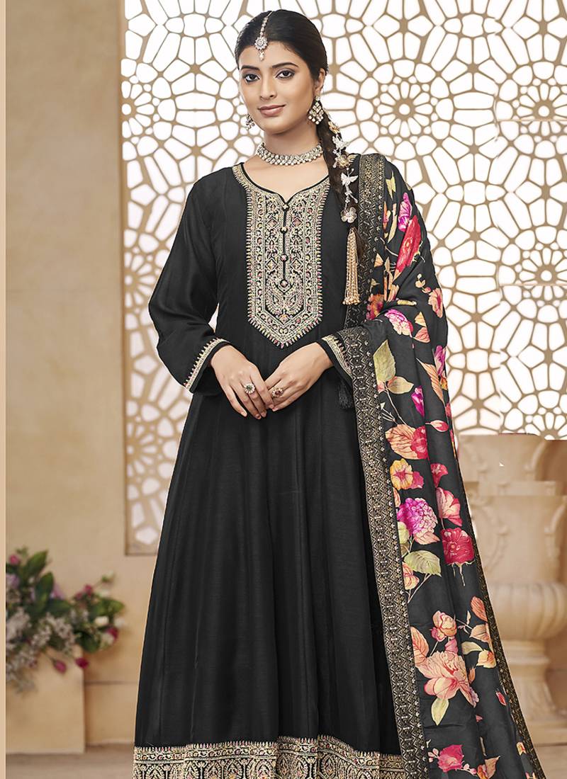 Fashion And Pattern Will Be At The Peak Of Your Beauty After You Attire This Black Vichitra Silk Anarkali Salwar Kameez. The Enticing Embroidered Work A Significant Feature Of This Attire. Comes With Matching Bottom And Dupatta. (Slight Variation In Color, Fabric & Work Is Possible. Model Images Are Only Representative.)