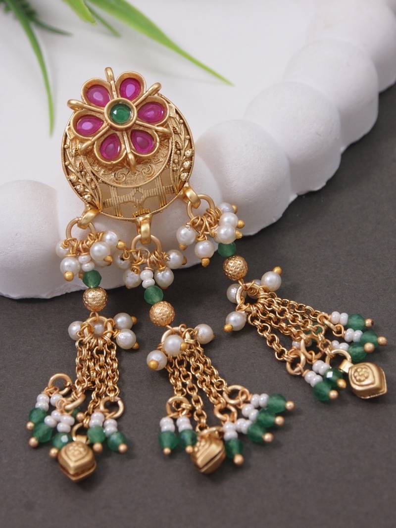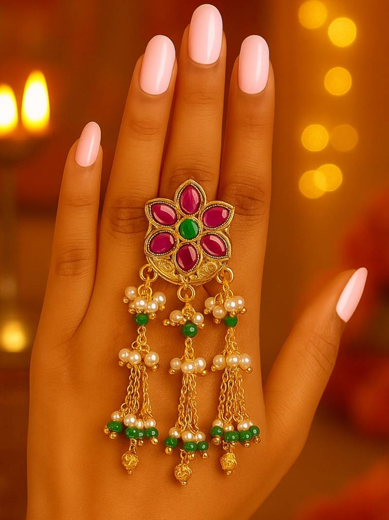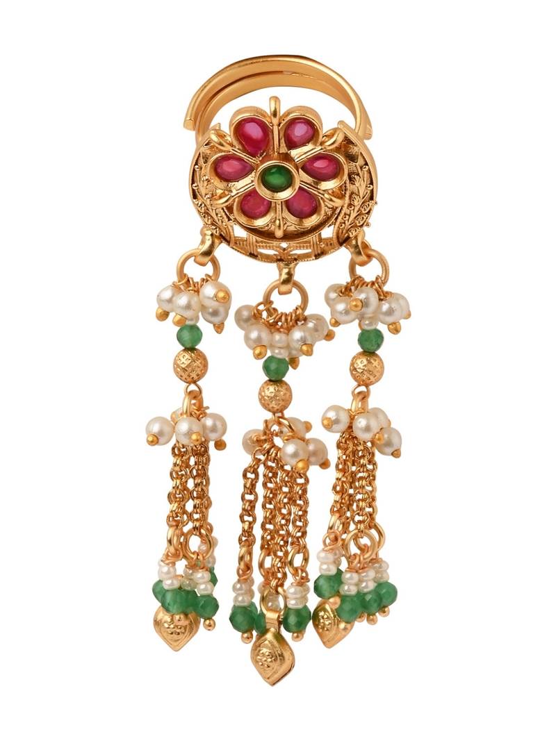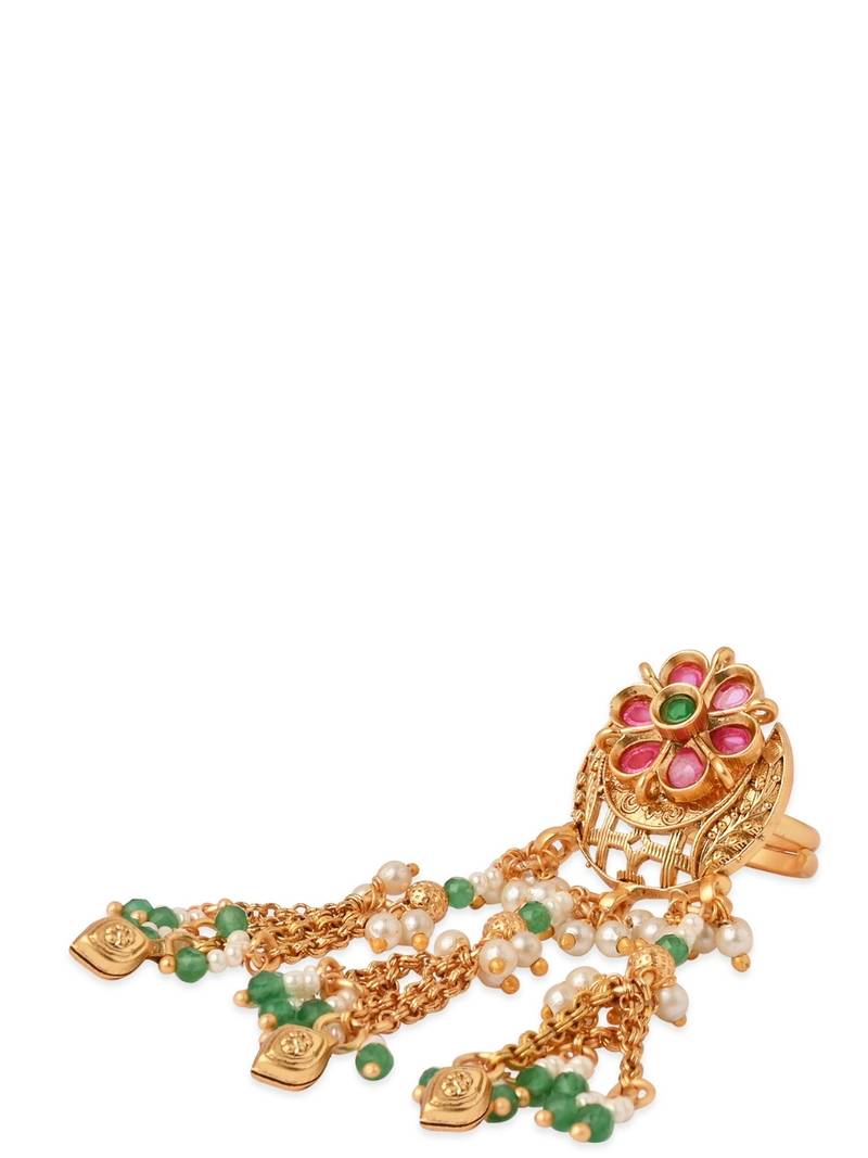 Product Name | Rajwadi Plated Brass Adjustable Finger Ring With Floral Design, Pearl Beads & Green Latkan Chains For Women | |