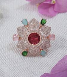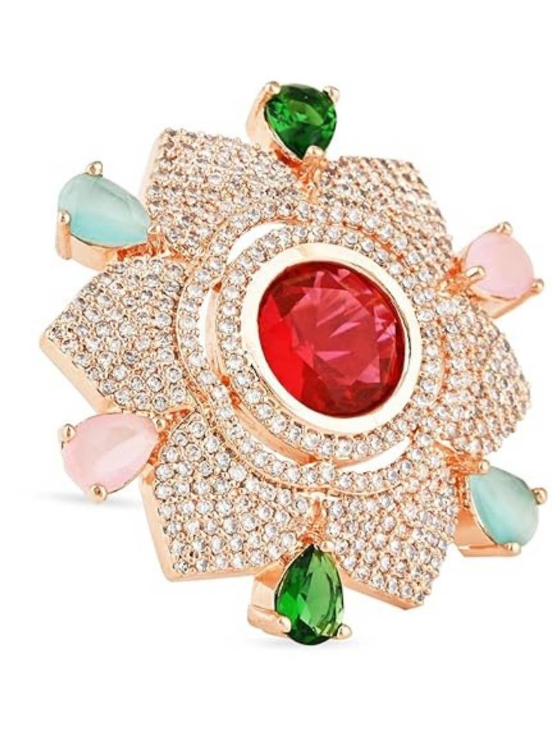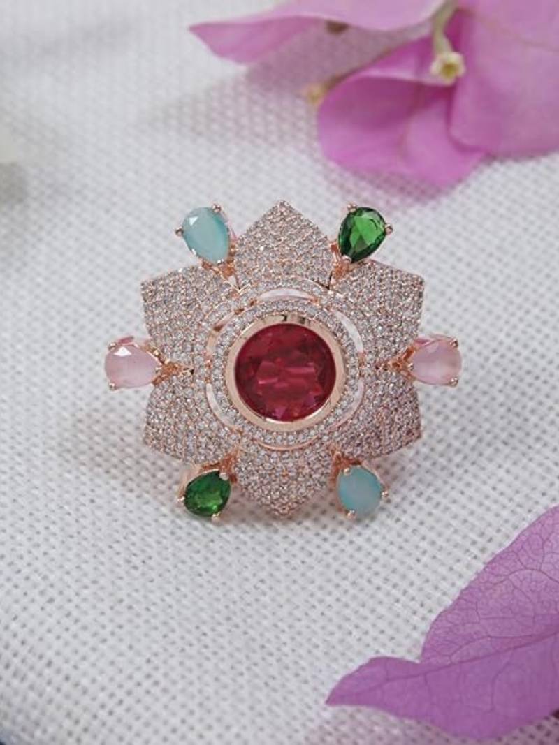 Rose gold plated special multicolor floral design diamond adjustable finger ring for women::Girls