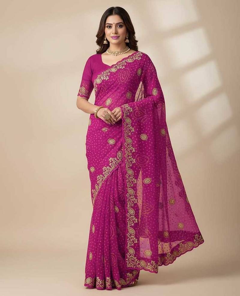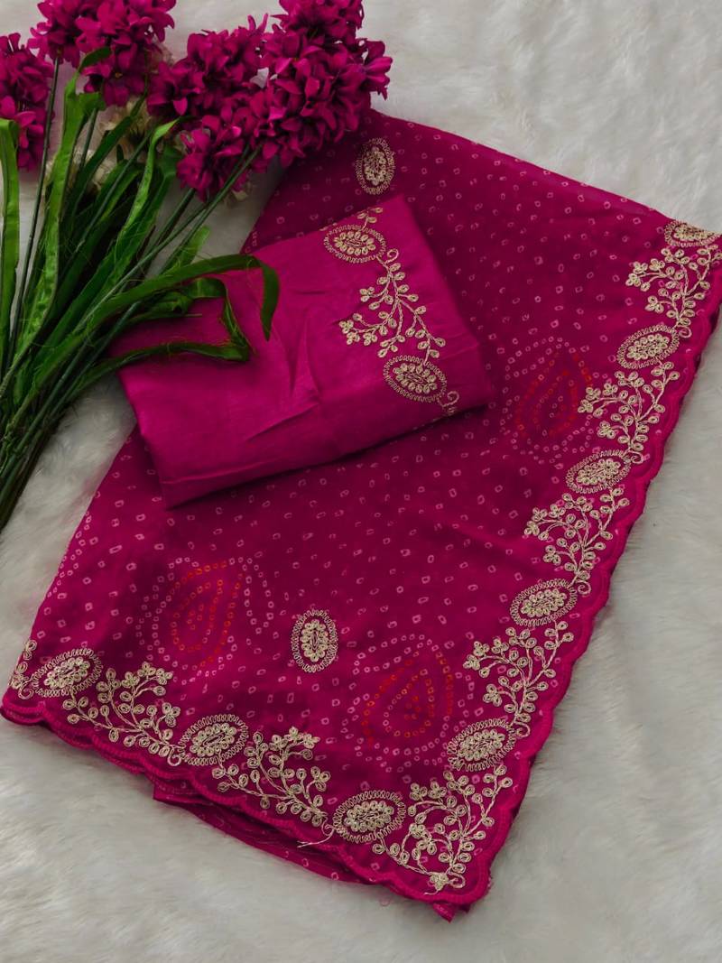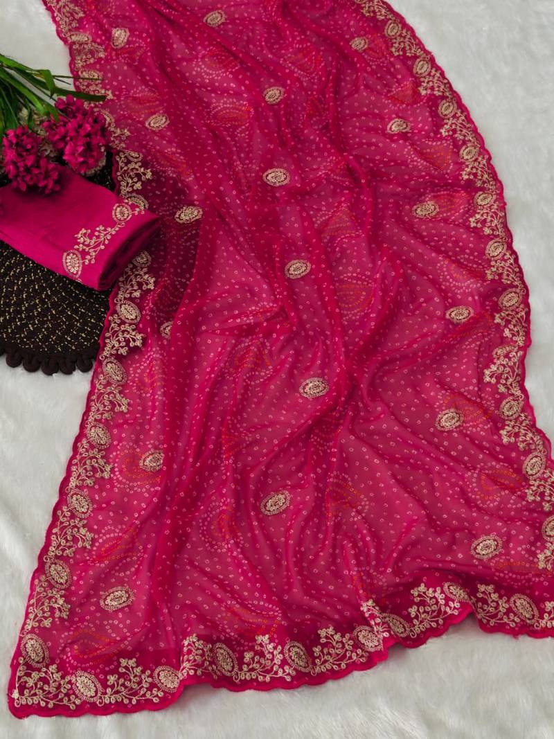 | Product Name | Soft Georgette Bandhni Print Saree With Sober Pitha Work Embroidery Pink Saree With Blouse Piece | |