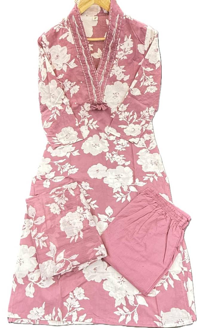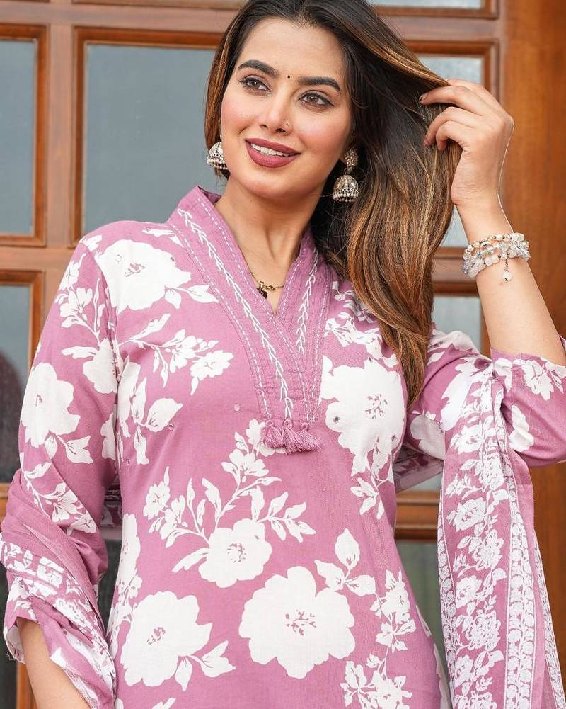 | Product Name | Beautiful Jaipuri Lavender Pink And White Floral Printed Cotton Kurta Set With A Matching Dupatta And Straight Pants. | |
