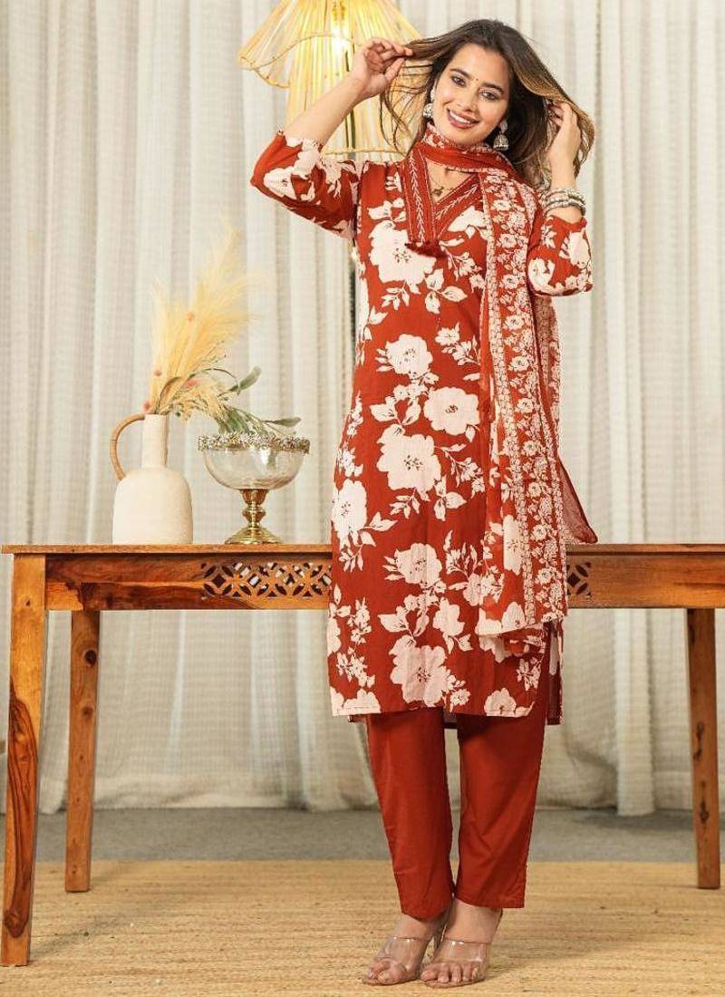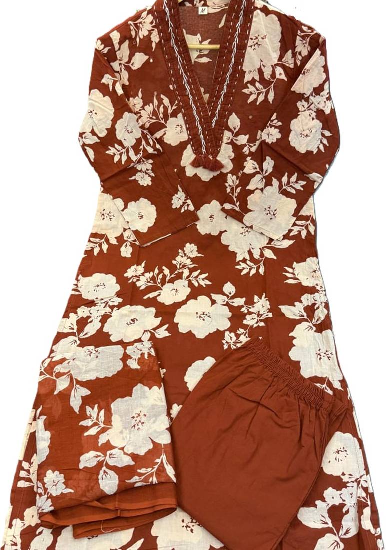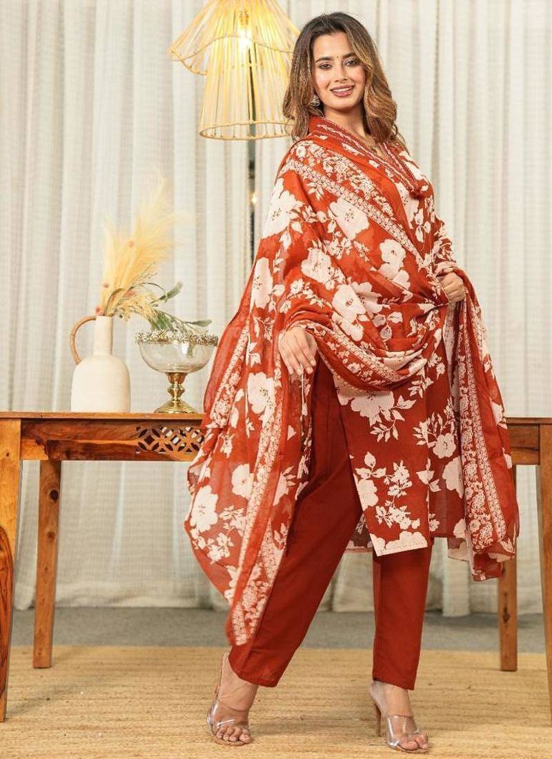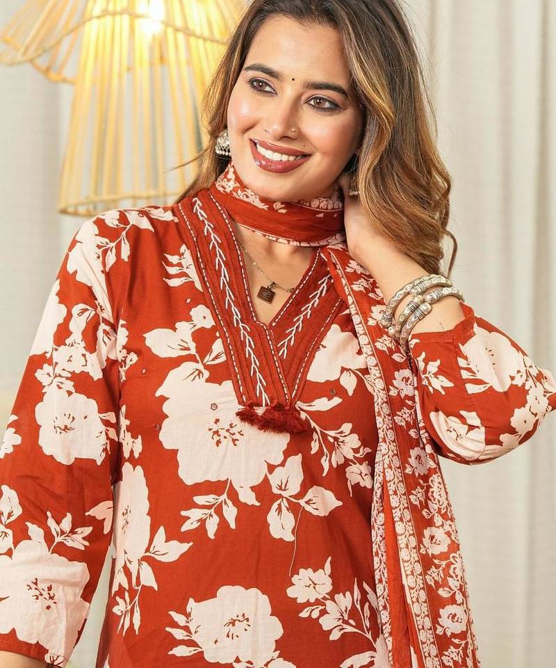 | Product Name | Beautiful Jaipuri Rust Orange And White Floral Printed Cotton Kurta Set With A Matching Dupatta And Straight Pants. | |