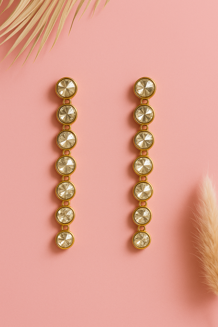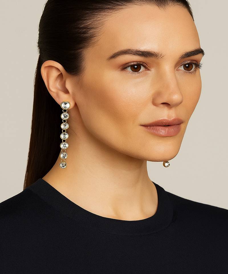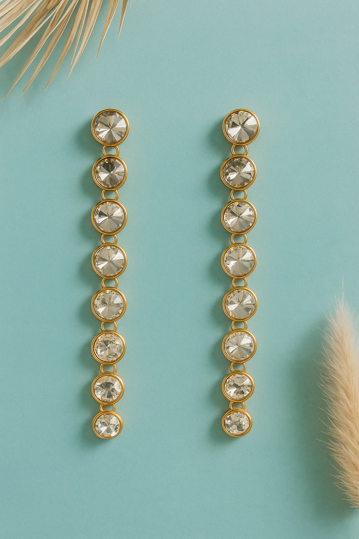 Shine Bright With These Elegant Long Drop Earrings Featuring A Cascade Of Linked Round Cut Crystals Set In A Sleek Gold Plated Frame. Their Shimmering Design Adds Instant Glam To Partywear, Evening Outfits, Or Festive Ensembles. Lightweight Yet Striking, Perfect For Making A Statement.