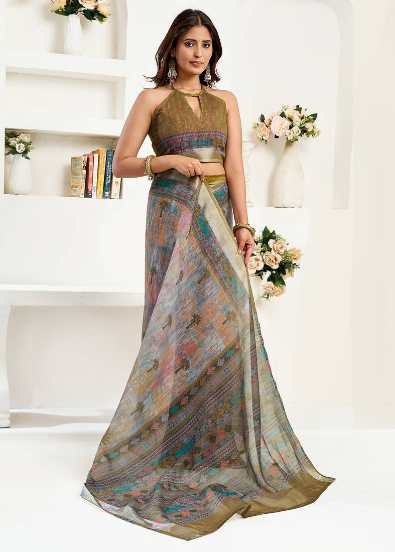 Women dusty green linen floral & ethnic motifs saree