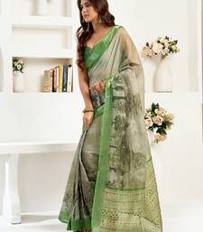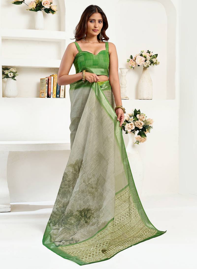 Women green linen floral & ethnic motifs saree