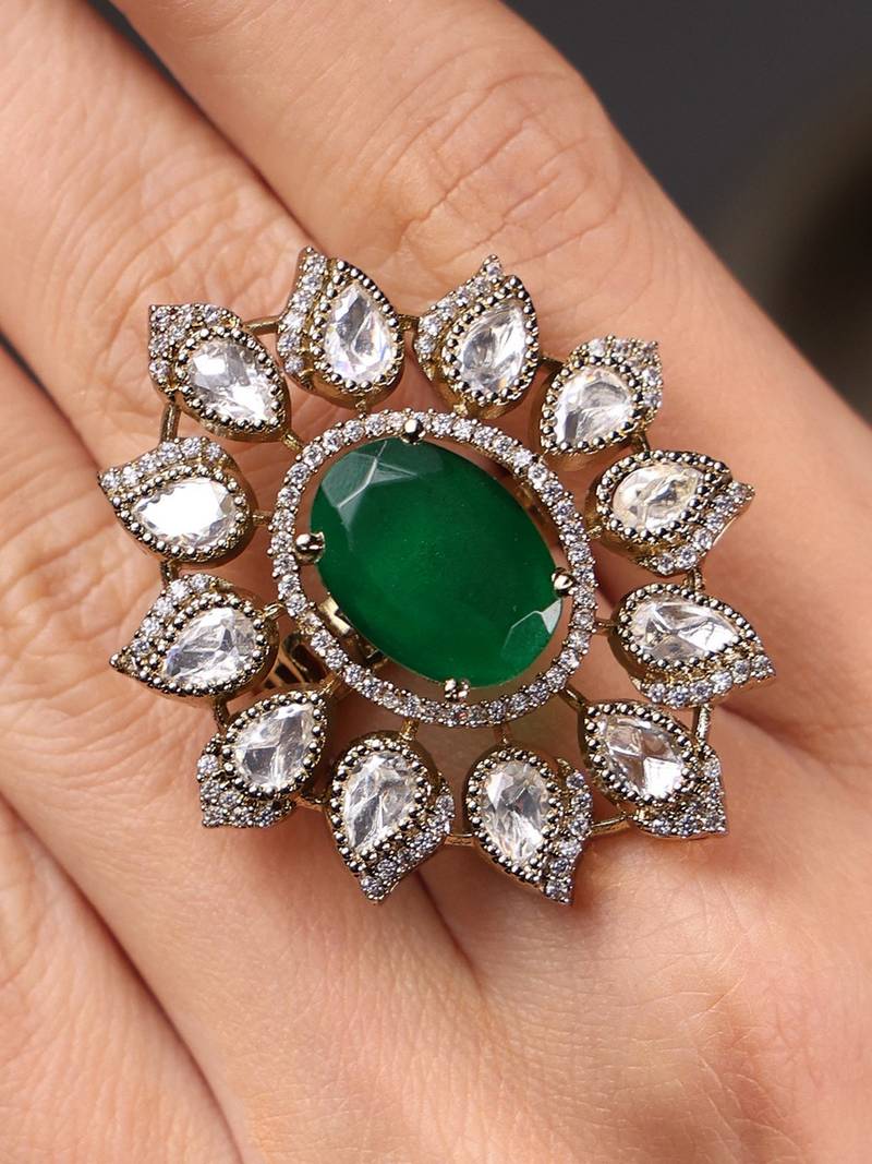 Product Description | The Emerald Sunburst Ring By Shober Features A Bold Green Stone Framed In Radiant Patterns. This Statement Ring Captures Light Beautifully, Making It An Elegant Choice For Festive Gatherings Or Parties.