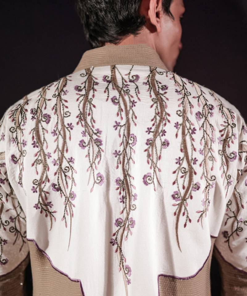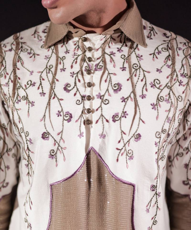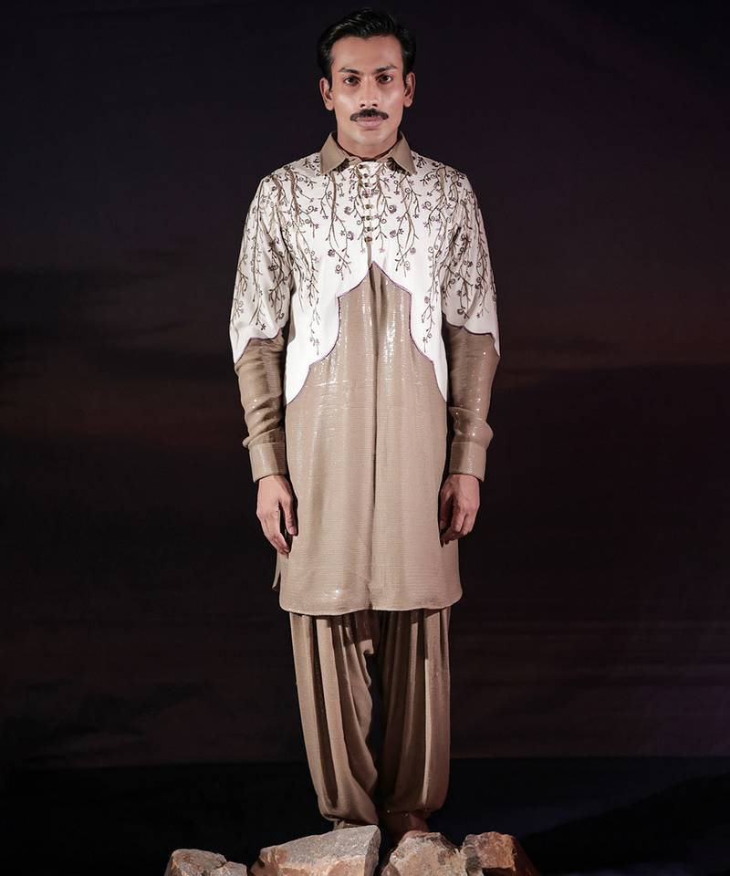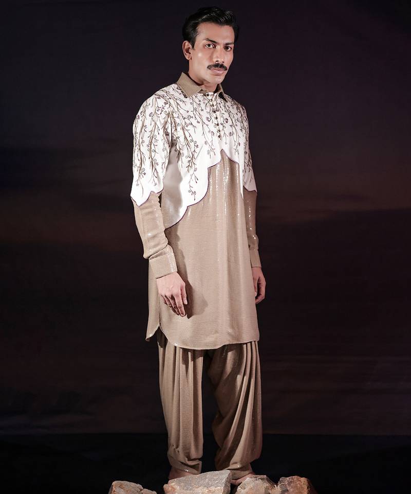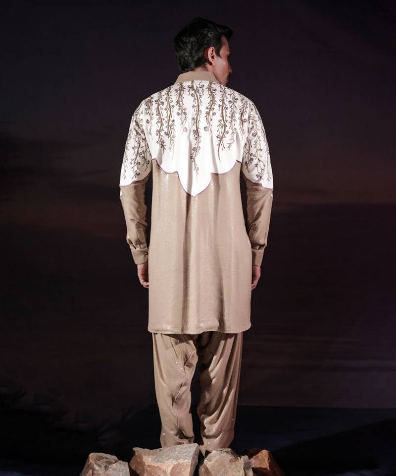 | Product Description | A Beige Sequined Georgette Pathani Set With Salwar Pants, Featuring A Sculpted White Silk Staple Patchwork Yoke. The Yoke Is Intricately Embroidered With Vine And Floral Motifs, Adding Depth And Elegance To The Shimmering Base