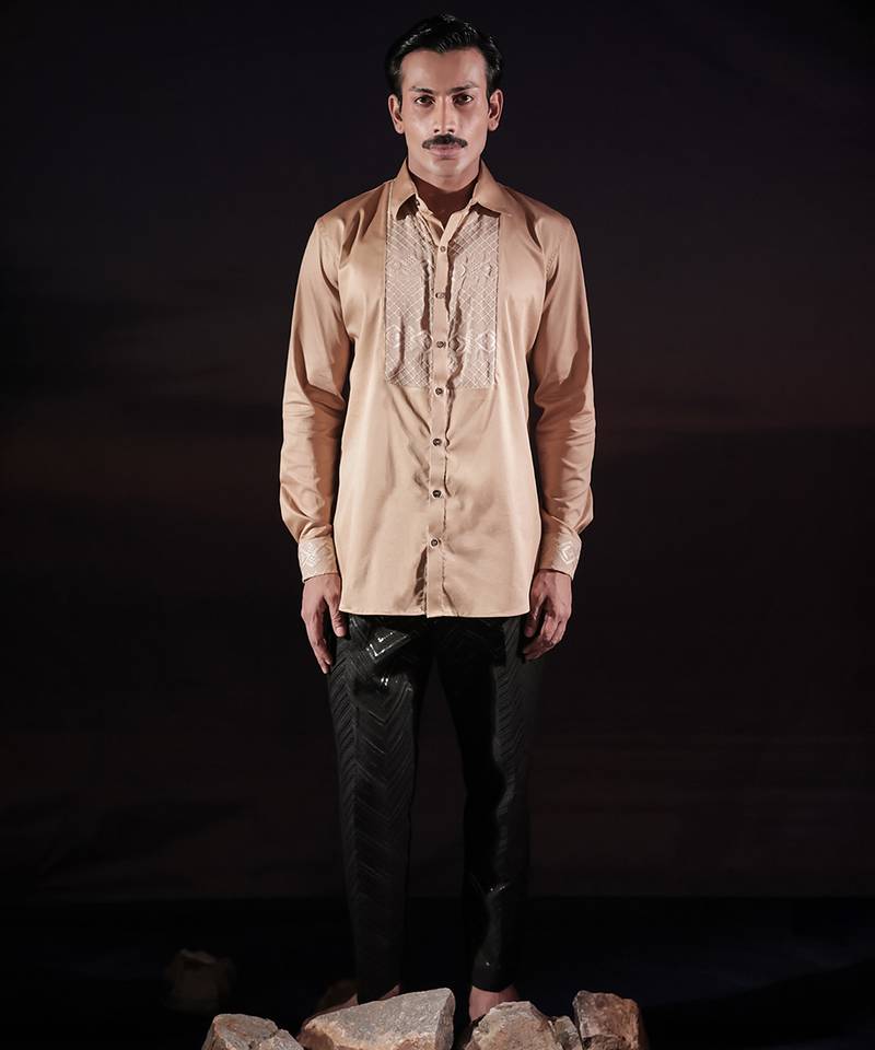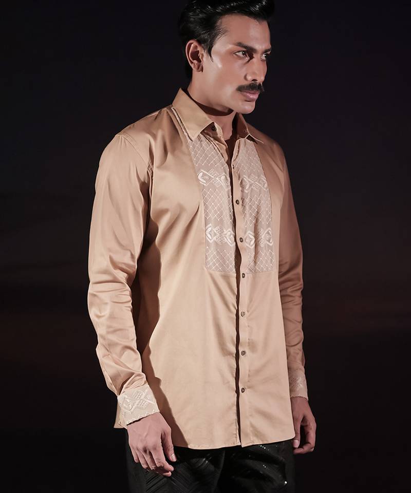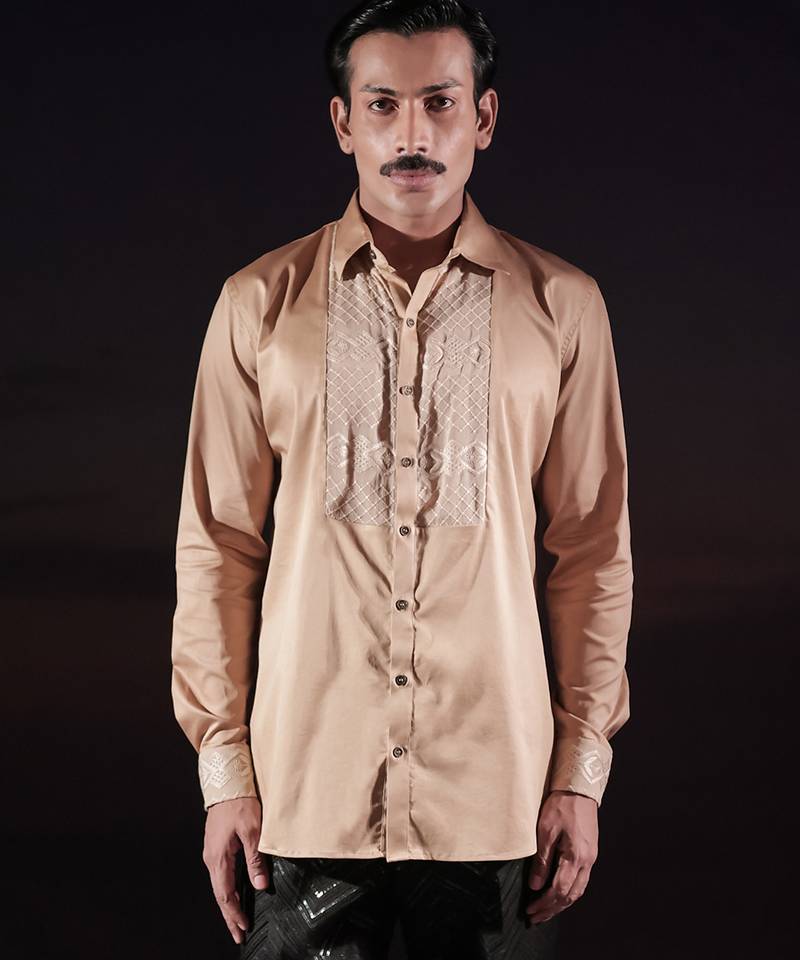 | Product Description | A Beige Cotton Lycra Full Sleeved Shirt Featuring A Chikankari Georgette Embroidered Front Panel, Complemented By Matching Embroidered Cuffs