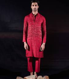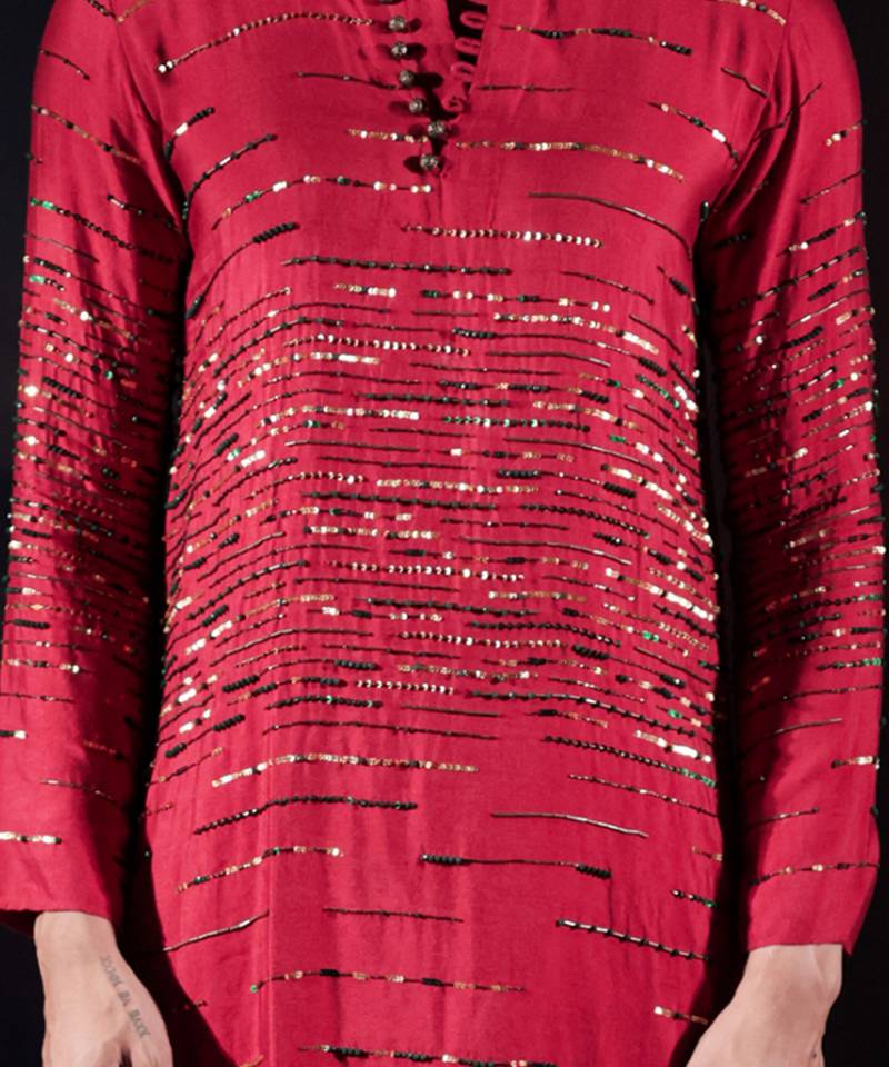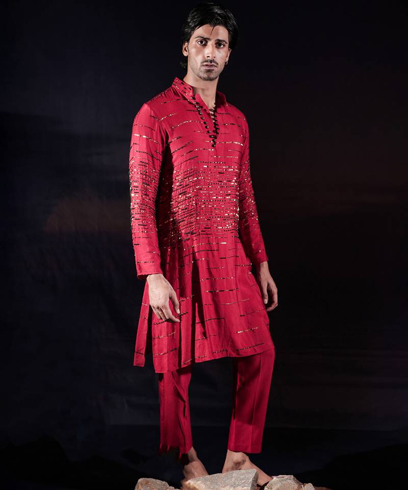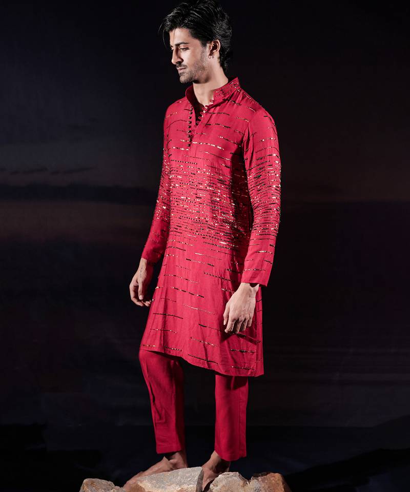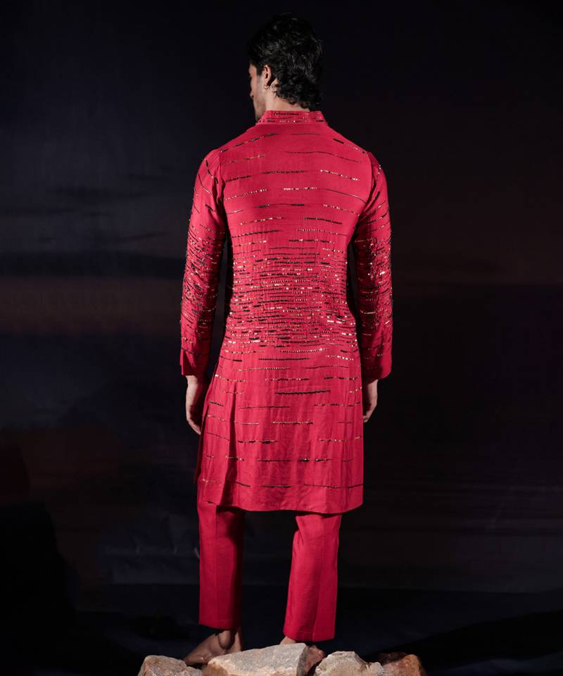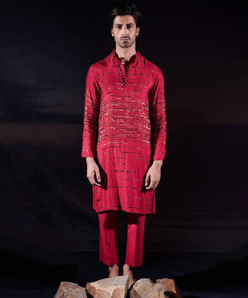 | Product Description | A Rich Red Silk Staple Kurta Set With Matching Pants, Intricately Hand Embroidered In Linear Patterns Of Sequins And Crystals, Creating A Subtle Yet Striking Shimmer