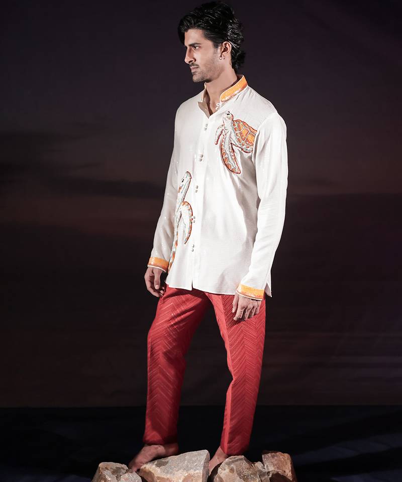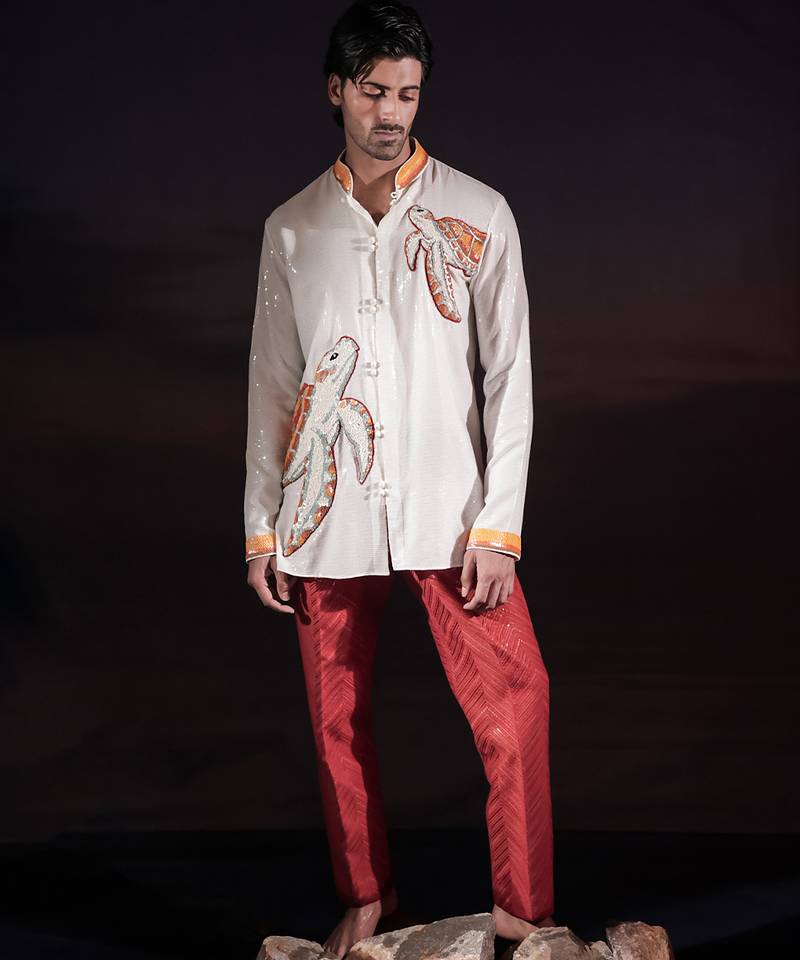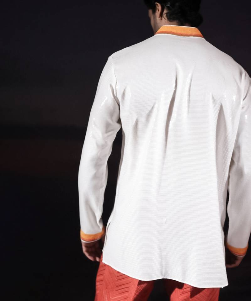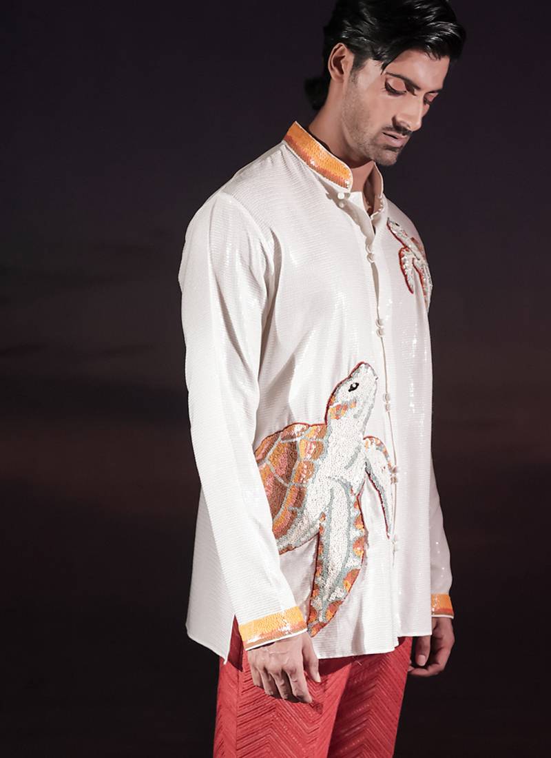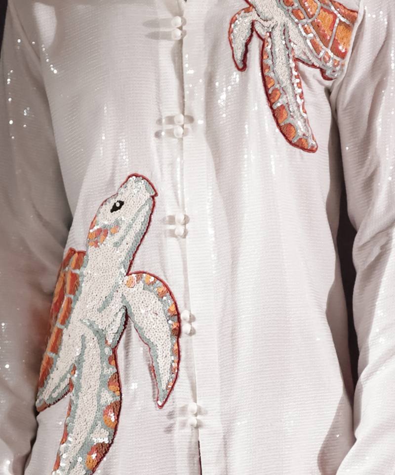 | Product Description | White Sequined Georgette Short Kurta Featuring Turtle Hand Embroidered Patchwork With Sequin Detailing On The Collar And Sleeve Hems, And Finished With A Front Opening Of Potli Buttons