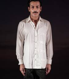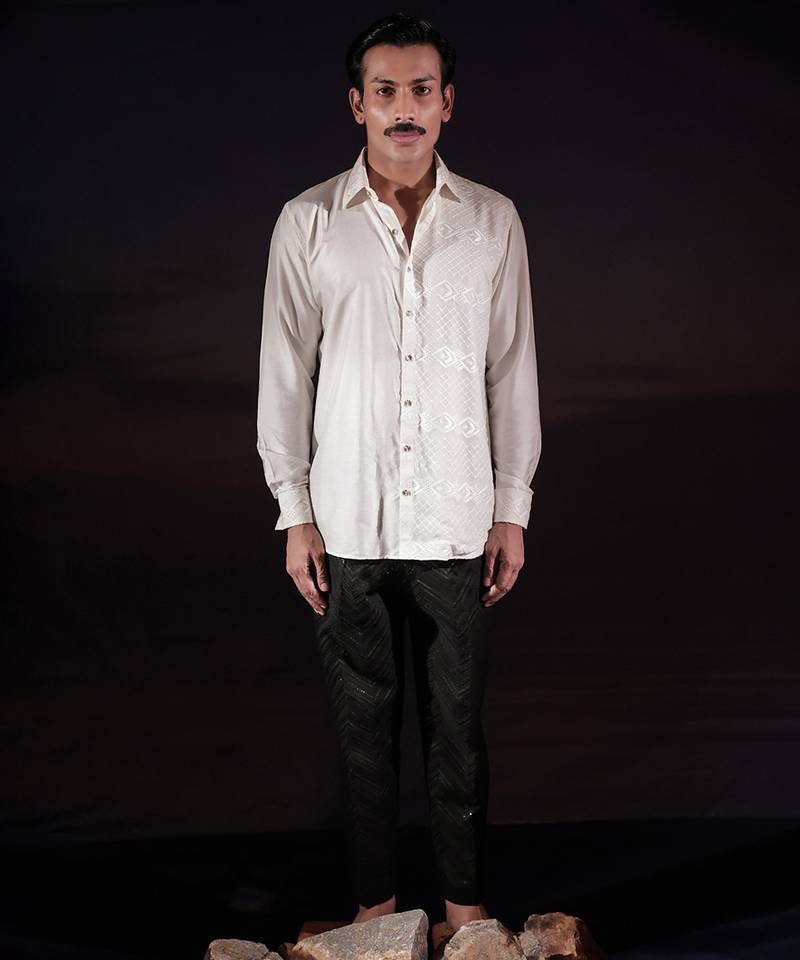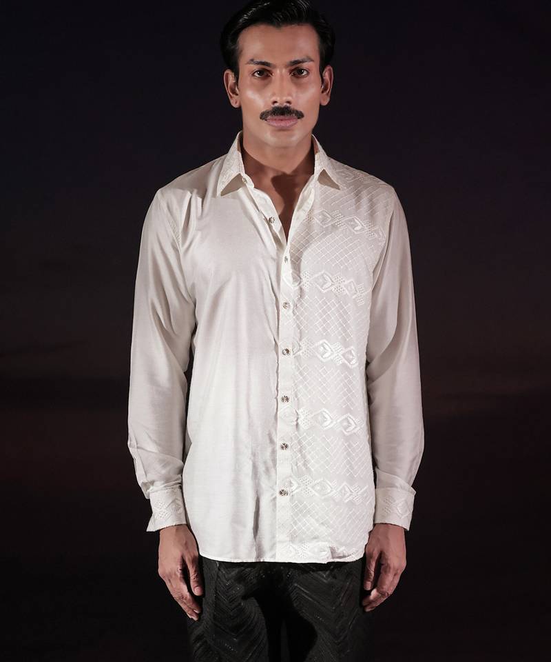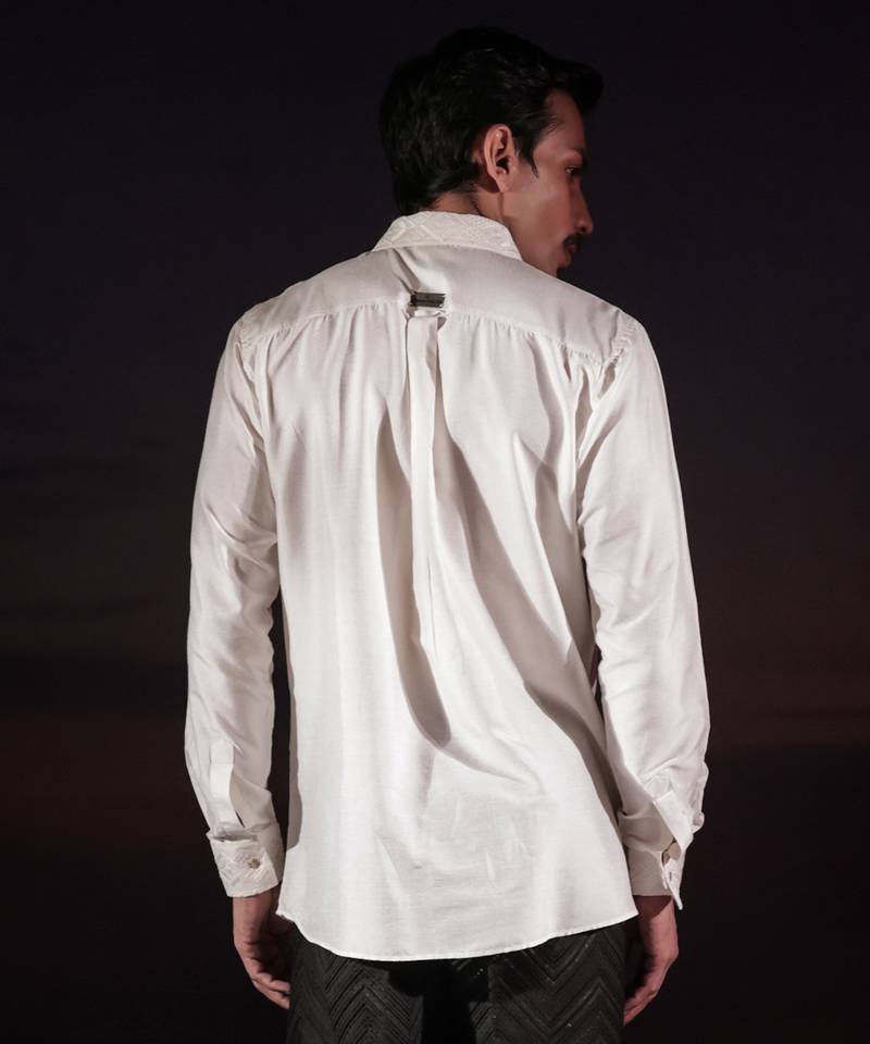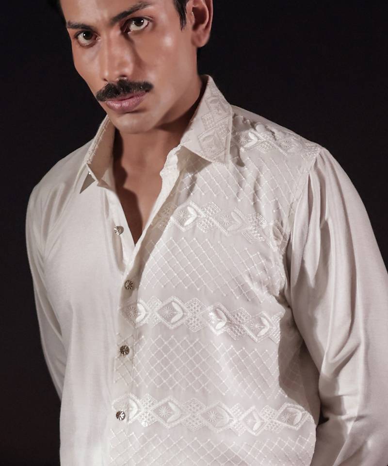 | Product Description | A White Silk Staple Full Sleeved Shirt Featuring A Single Chikankari Georgette Panel Along The Front Placket, With Matching Chikankari Detailing On The Cuffs And Collar