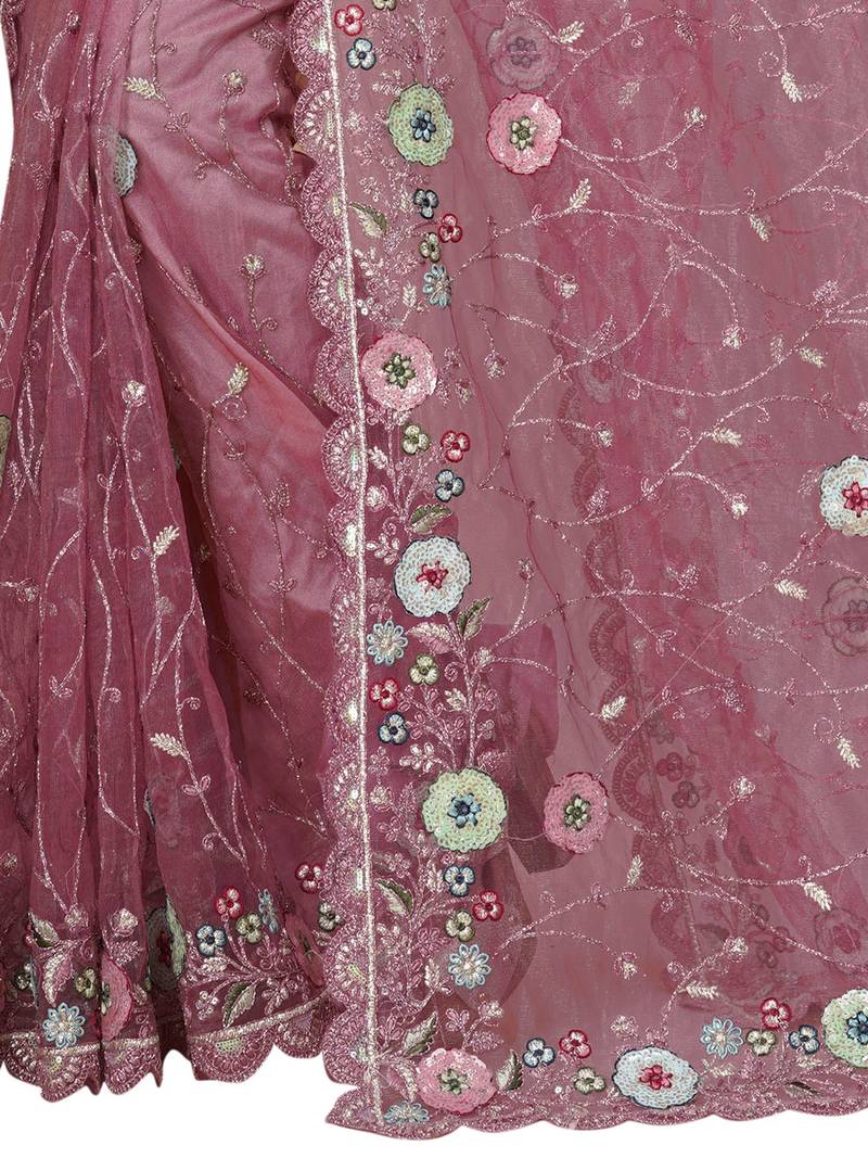 dusty pink net saree with resham embroidery