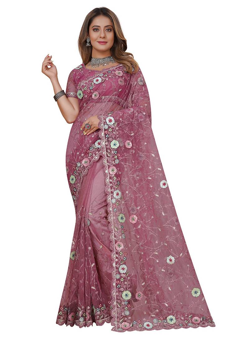 Product Name Pink Net Saree With Resham Embroidery