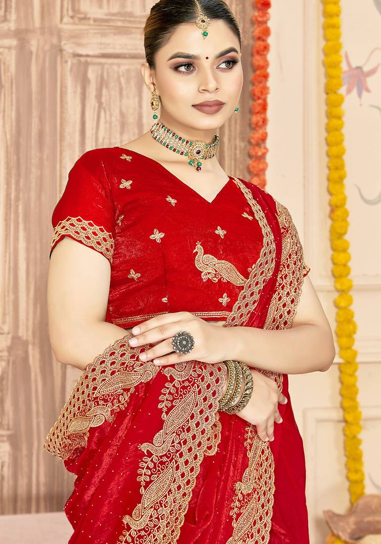 | Product Description | Red Silk Saree With Intricate Zari And Sirovski Embroidery Work Across The Body And Pallu, Paired With An Unstitched Blouse Piece. This Ethnic Saree Features A Smooth Drape And Rich Texture That Enhances The Red Tone With Detailed Thread And Embellishment Designs. The Embroidered Borders And Accents Provide Visual Depth While Maintaining A Balanced Silhouette Suitable For Weddings, Festive Gatherings, Cultural Occasions, And Traditional Events. Crafted From Quality Silk Fabric, This Saree Allows Comfortable And Elegant Wear. The Included Unstitched Blouse Piece Can Be Tailored To Match Your Preferred Fit And Style. |