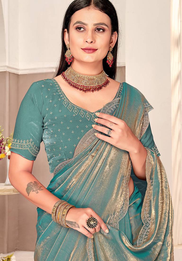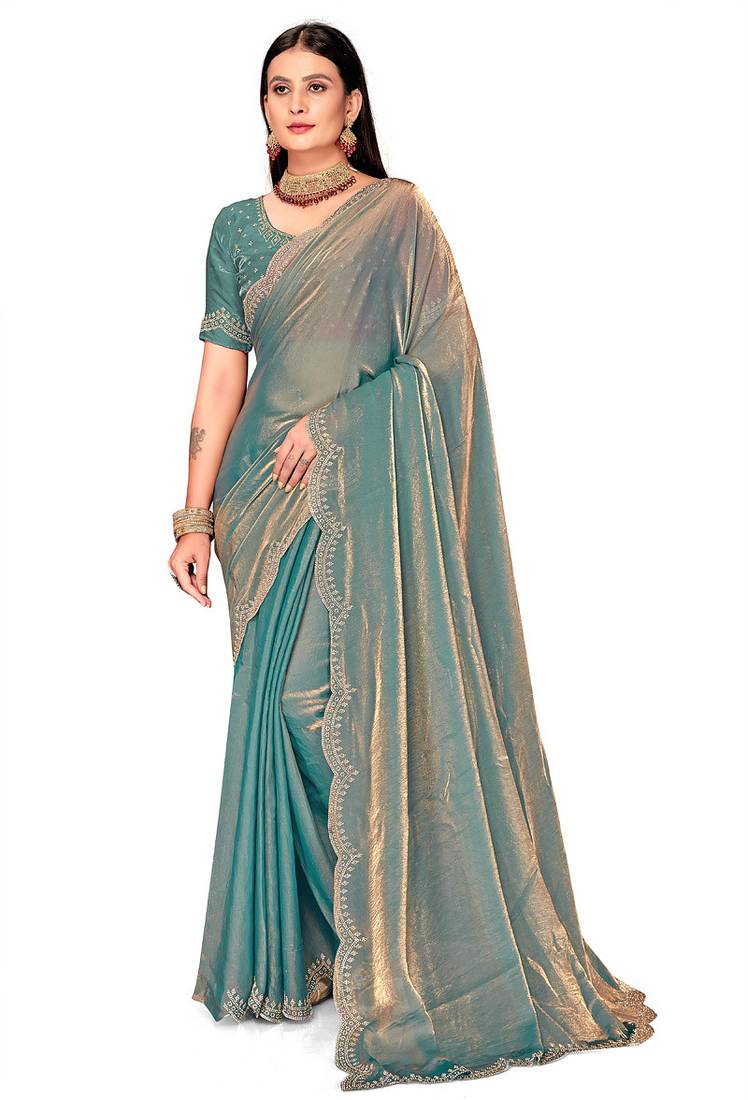 Traditional indian dusty rama handwork zarkan border silk blend saree
