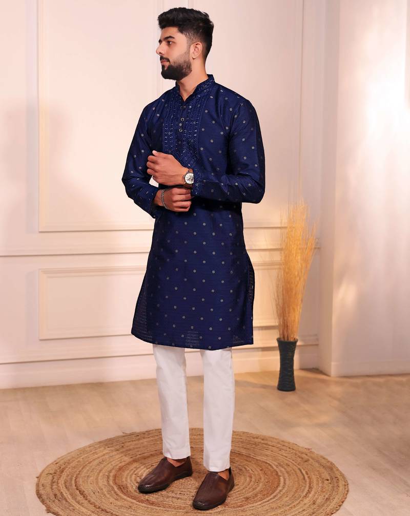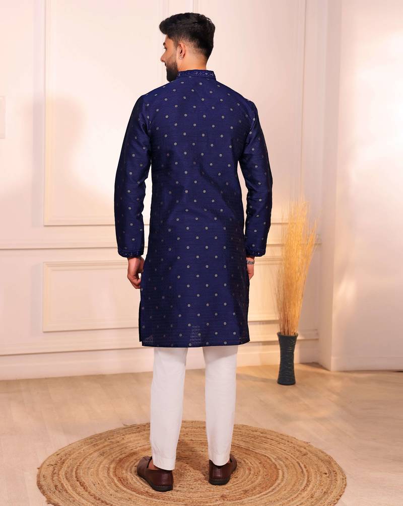 Blue color jacquard silk fabric designer embroidered kurta payjama for men's