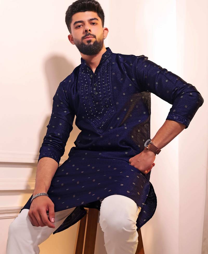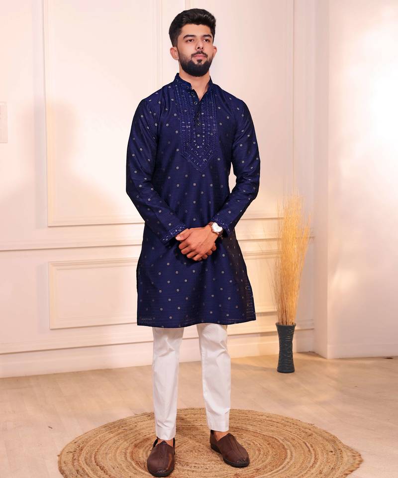 | Product Name | Blue Color Jacquard Silk Fabric Designer Embroidered Kurta Payjama For Men's | |