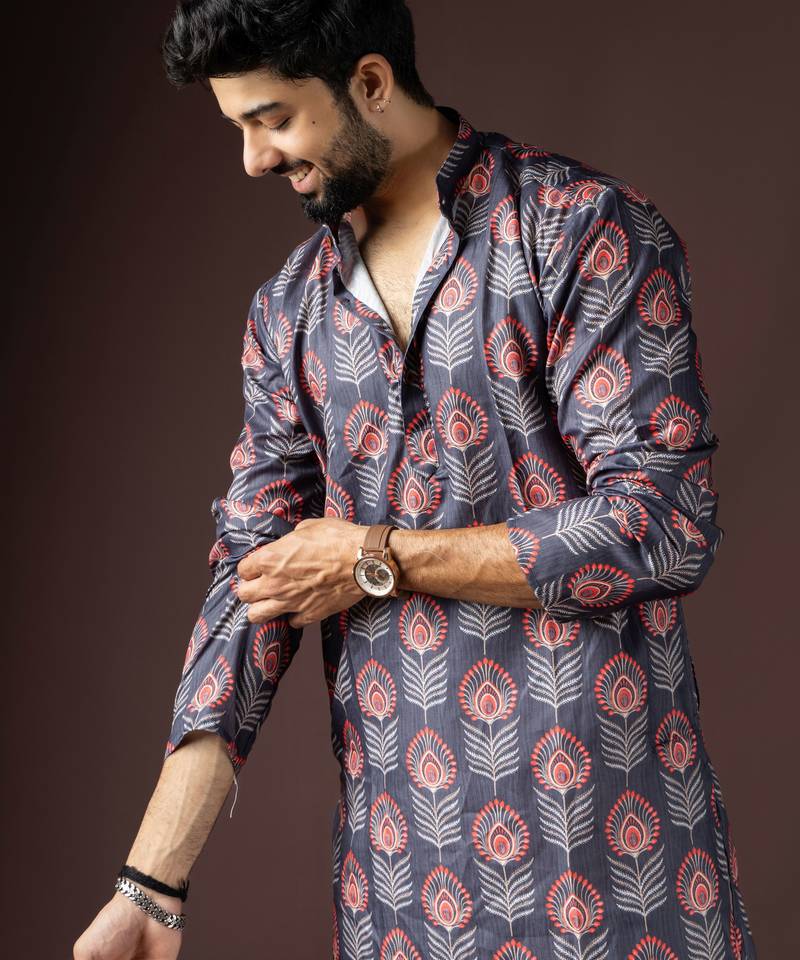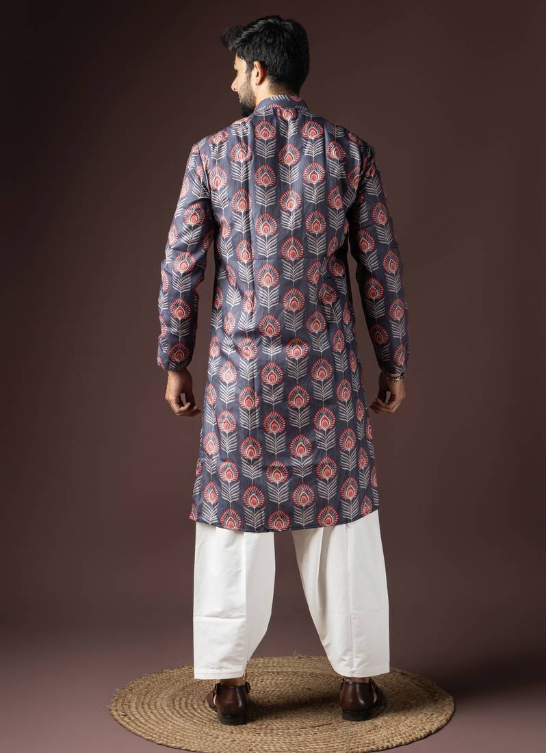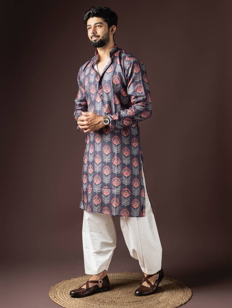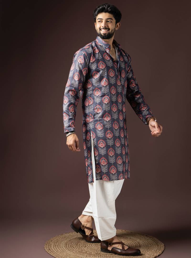 Product Name Dark Grey Color Beautiful Printed Blended Cotton Fabric Ceremonial Men's Kurta Payjama