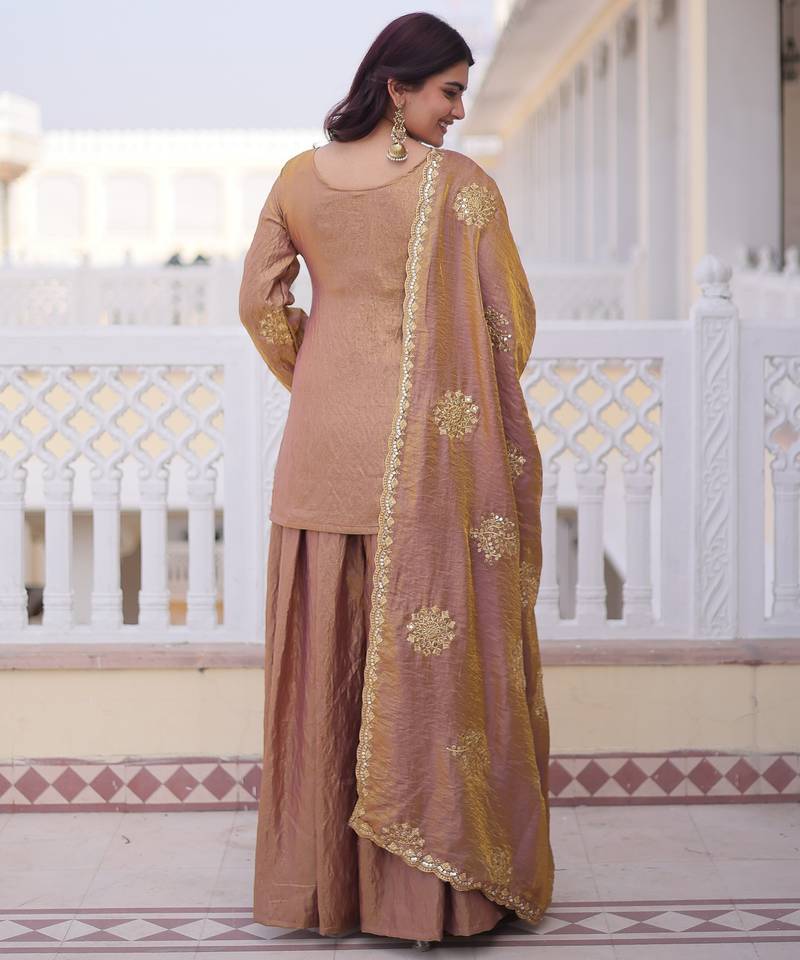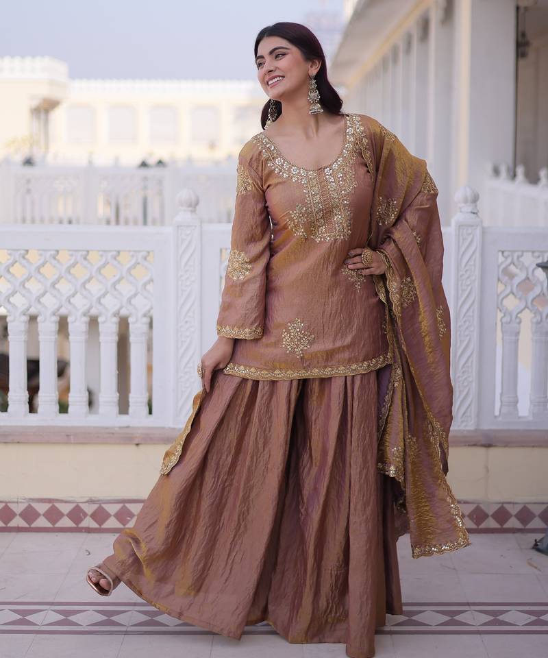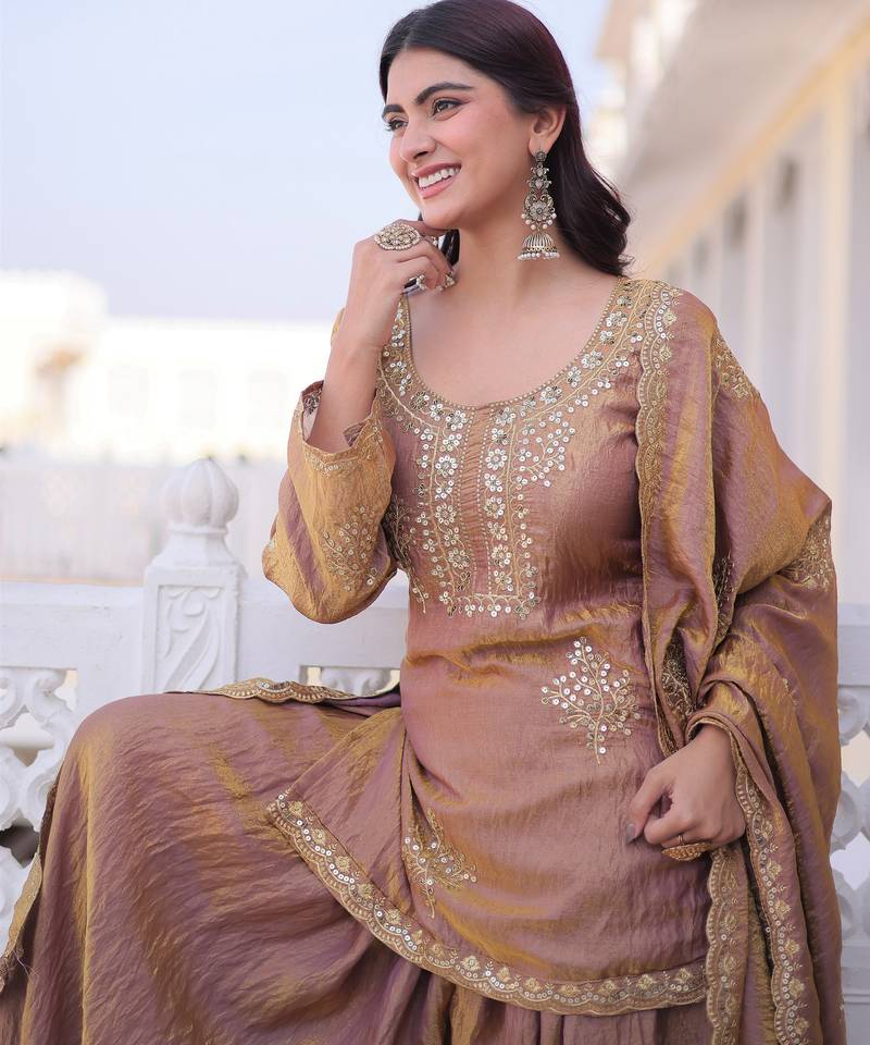 Product Name Gold Color Fendy Crush Fabric Designer Heavy Embroidered Ceremonial Suit