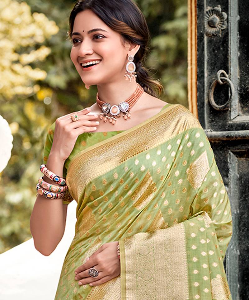Mint green color assam silk blend fabric woven designer saree for party looks