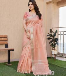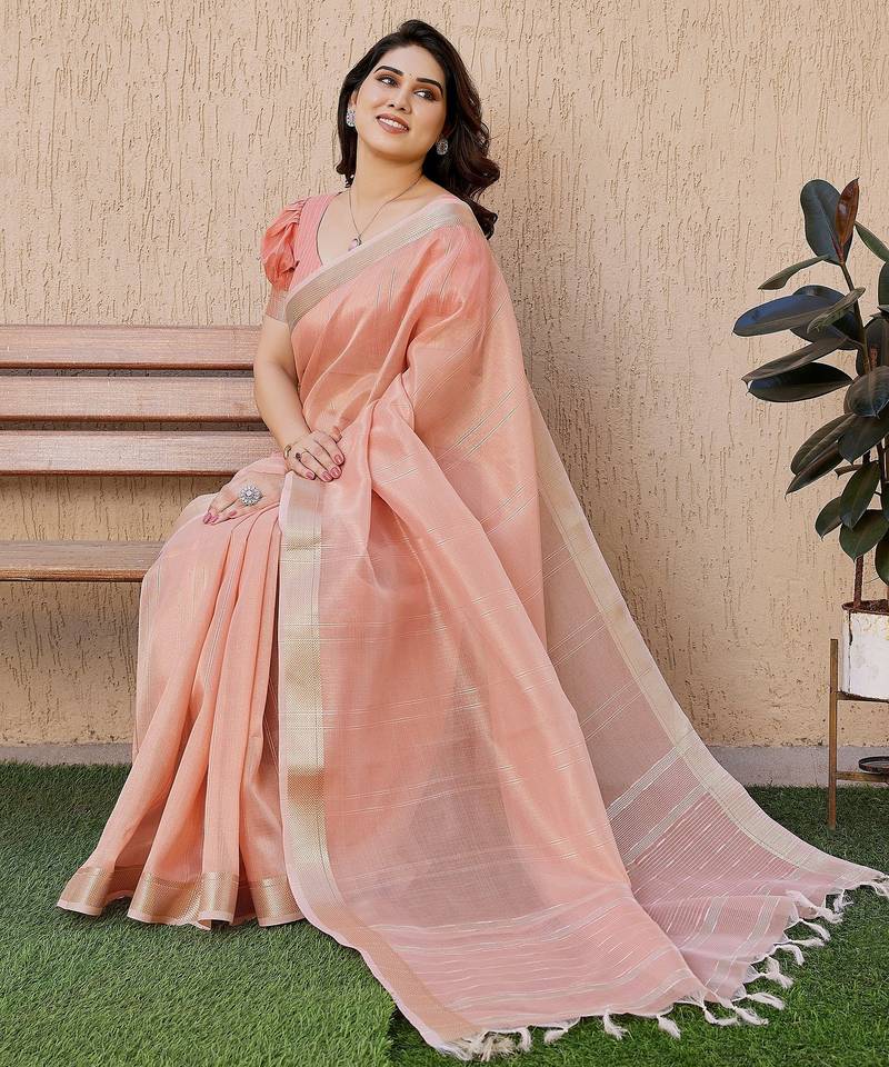 Peach color tissue linen art silk fabric weaving jari lining designer saree