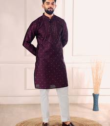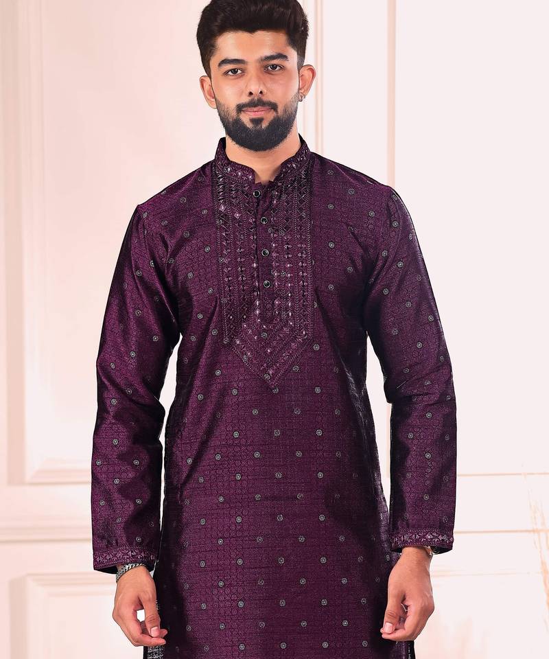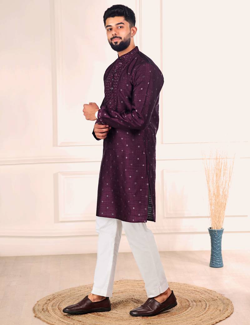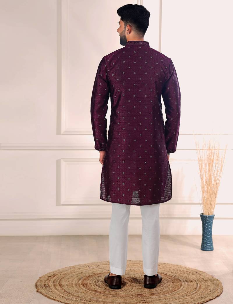 Wine color jacquard silk fabric designer embroidered kurta payjama for men's