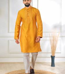 Yellow color jacquard silk fabric designer embroidered kurta payjama for men's