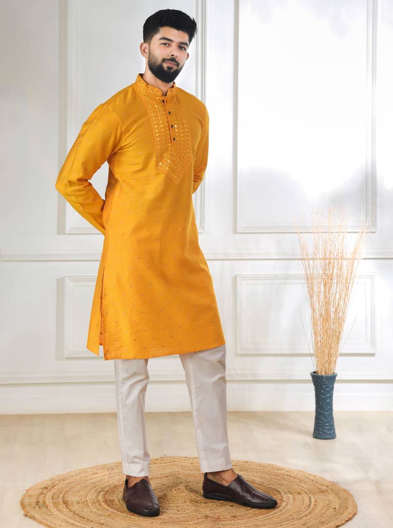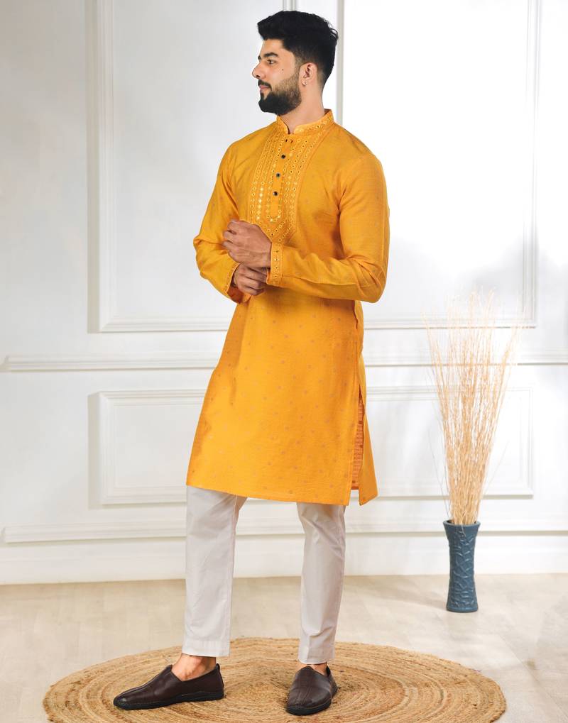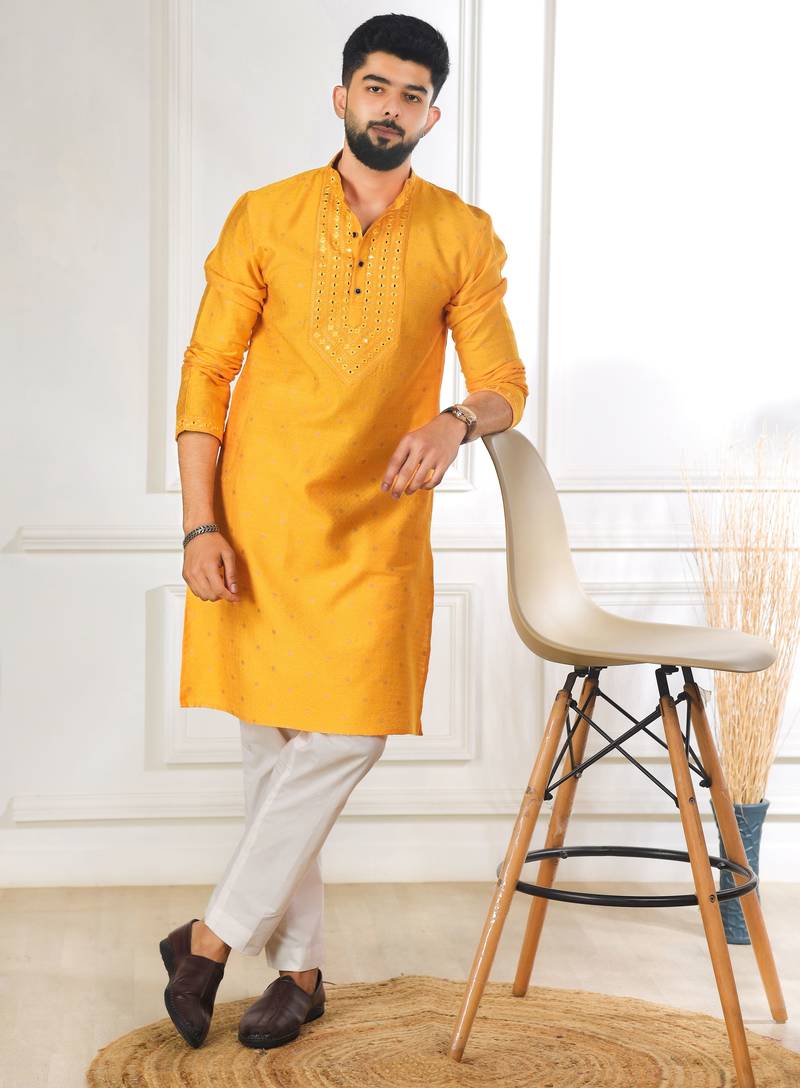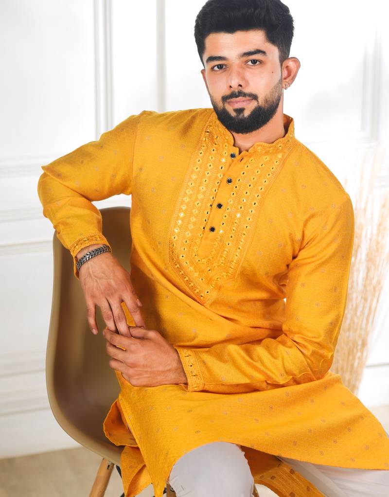 Product Name Yellow Color Jacquard Silk Fabric Designer Embroidered Kurta Payjama For Men's