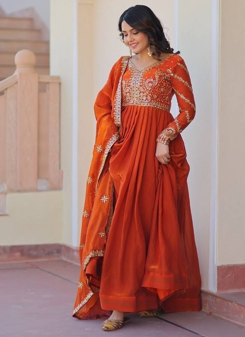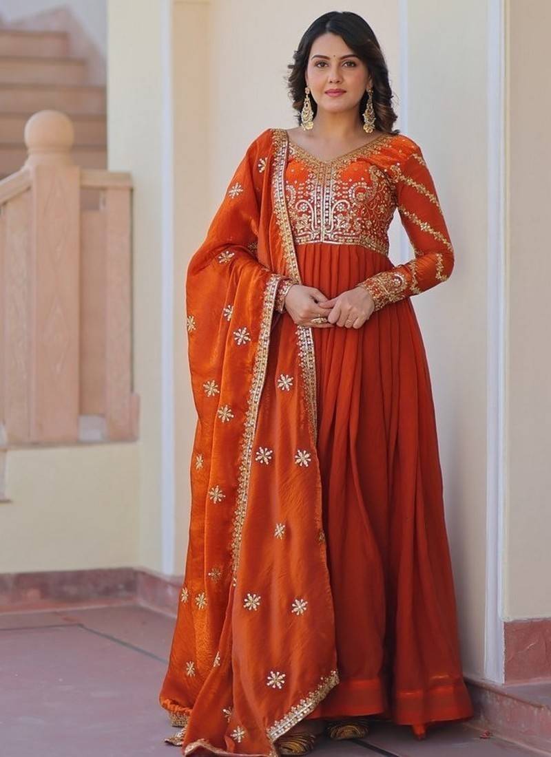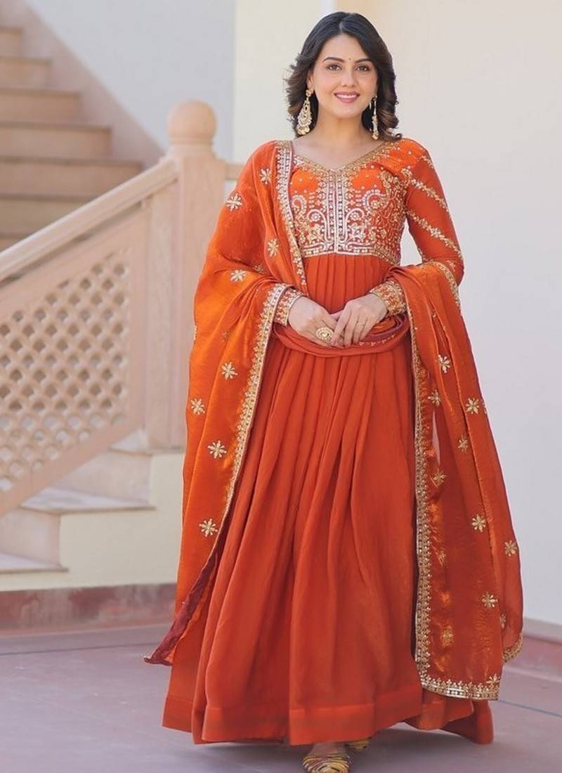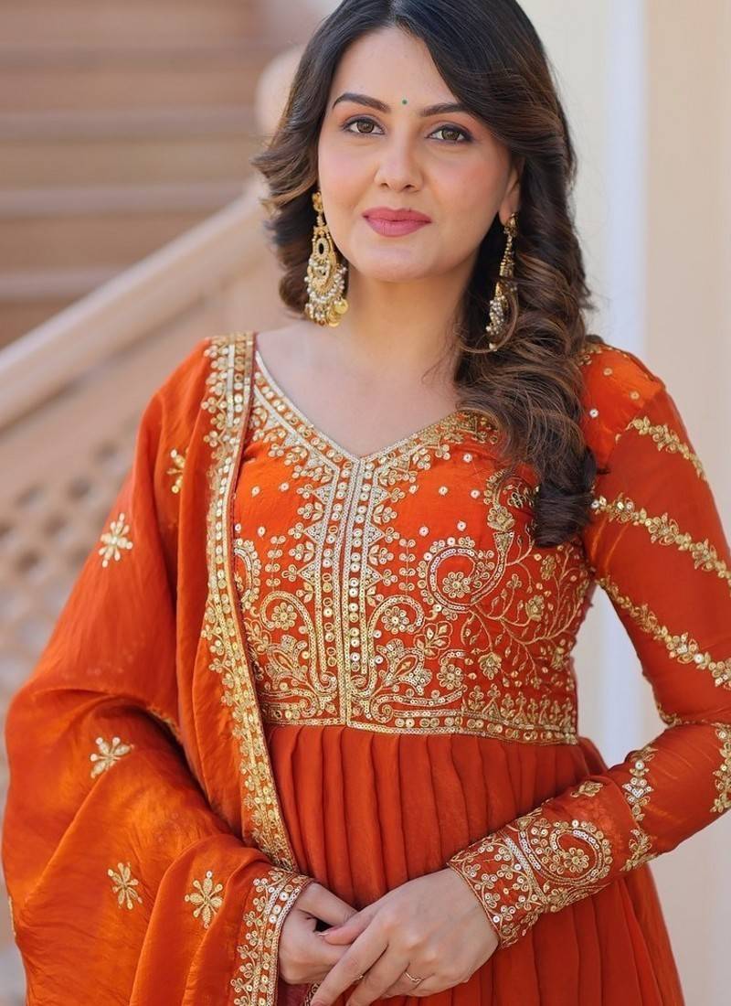 Product Name Orange Zari & Sequins Embroidered Work Fendy Stitched Kurta & Dupatta Set