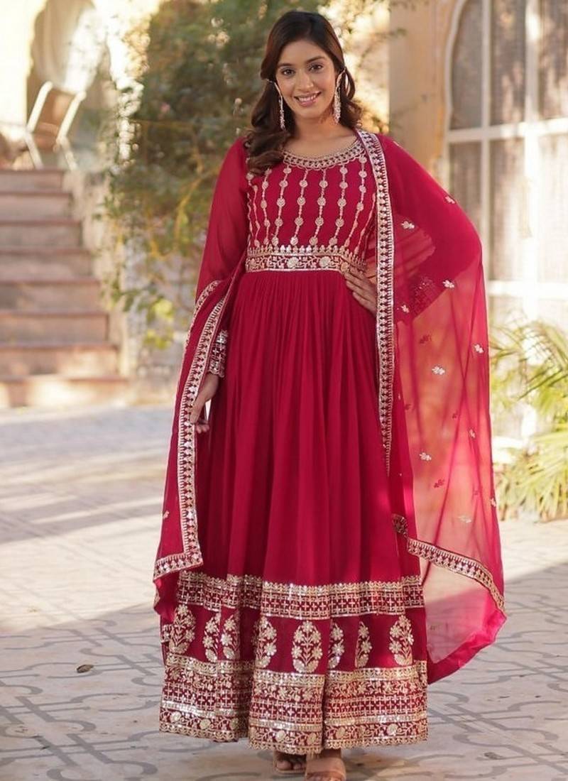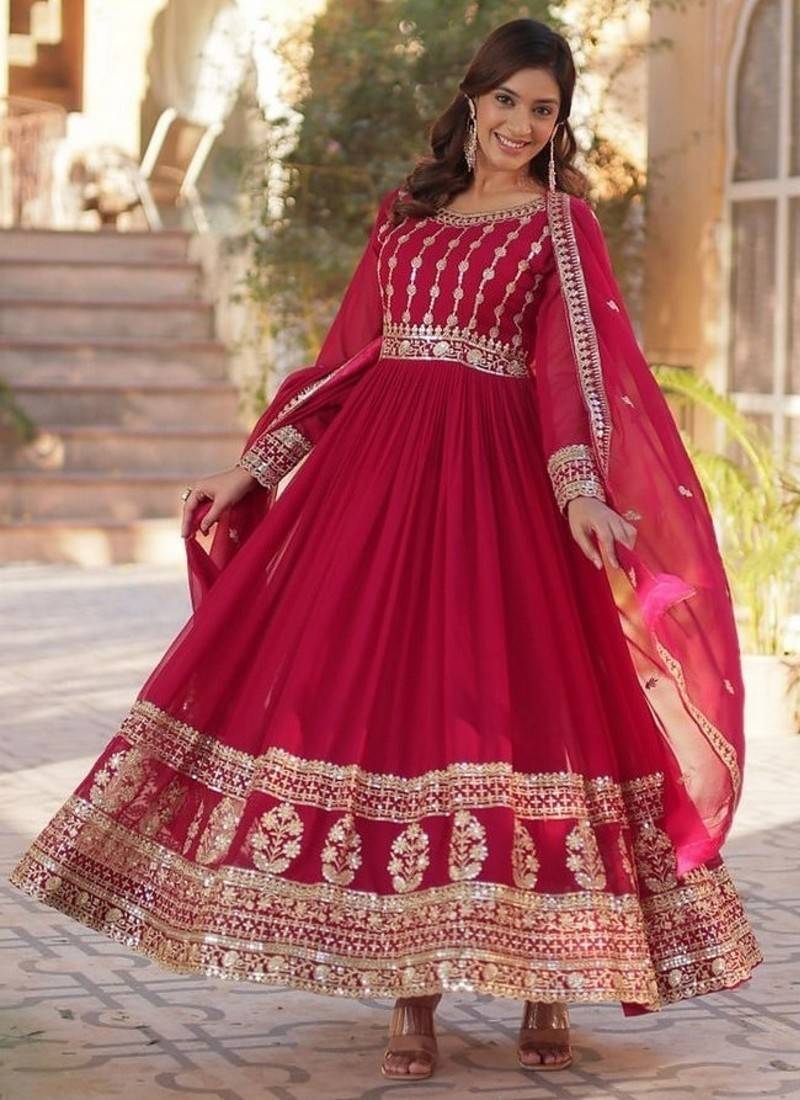 Pink zari & sequins embroidered work georgette stitched kurta & dupatta set
