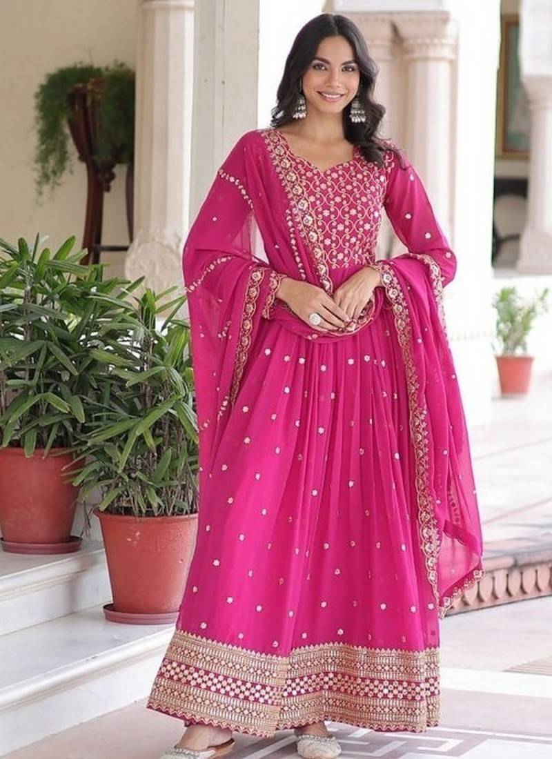 Pink zari & sequins embroidered work georgette stitched kurta & dupatta set
