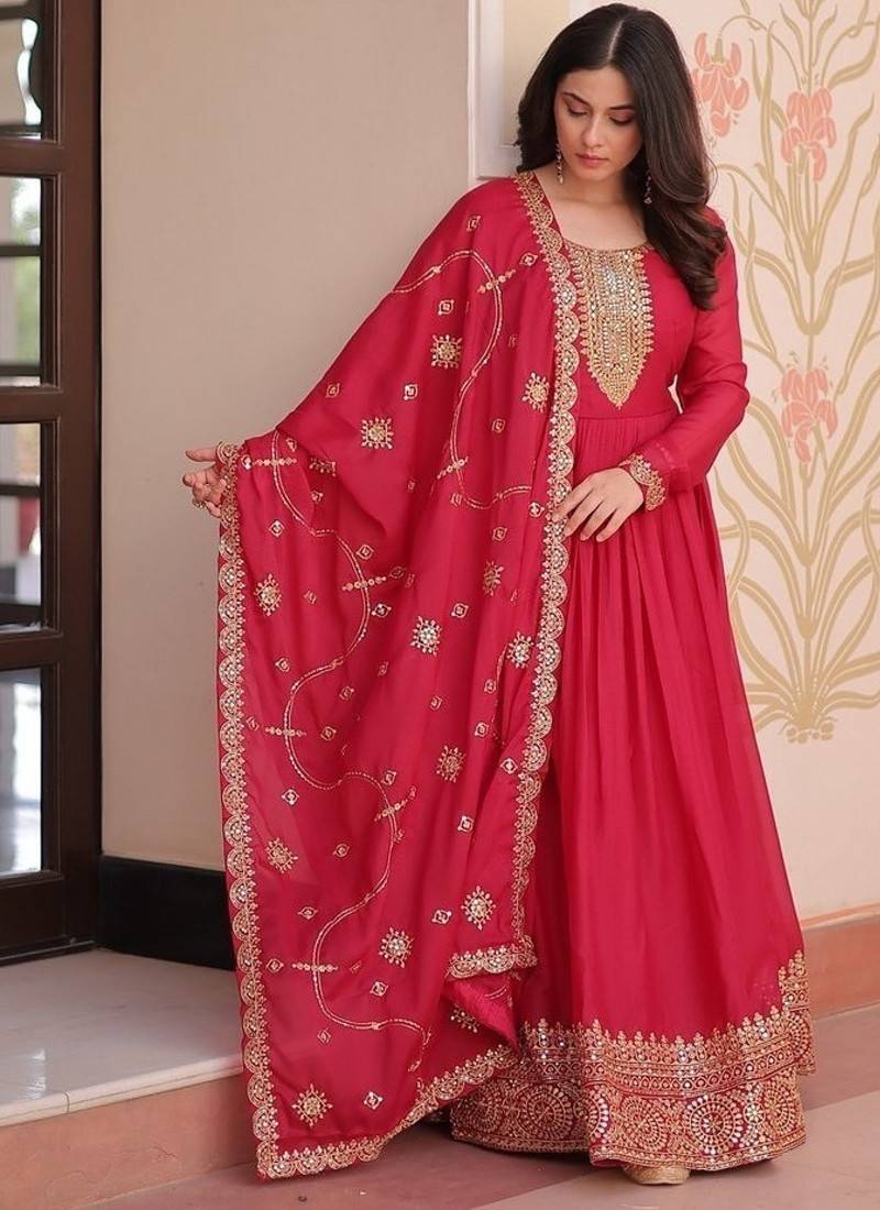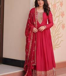 Pink zari & sequins embroidered work georgette stitched kurta & dupatta set
