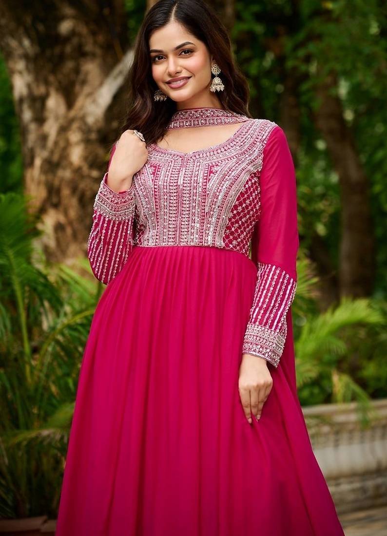 Pink zari & sequins embroidered work georgette stitched kurta & dupatta set