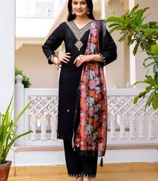 Women's black viscose chanderi silk embroidered kurta pant set with jacquard organza dupatta