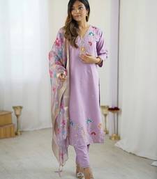 | Pattern | Kurta: Solid Lavender Viscose Silk With Sequin & Stone Floral Work Pant: Solid Tailored Pant Dupatta: Printed Organza Style: Floral Embroidered Festive Set | |