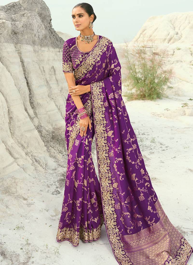Saree Fabric: Pure Dola Viscose, Saree Color: Dark Violet, Blouse Fabric: Pure Silk, Blouse Color: Dark Violet, Work: Jari, Thread, Moti With Cut Dana Heavy Work, Remark: Saree With Blouse