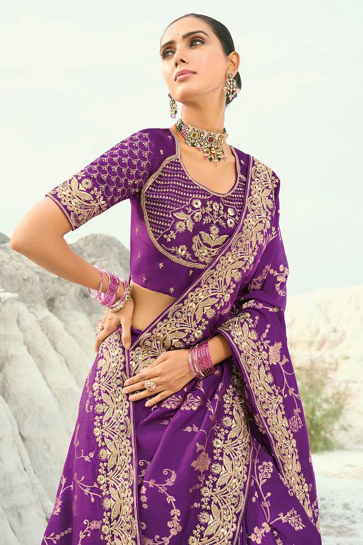 Product Name Dark Violet Dola Viscose Jari, Thread, Moti With Cut Dana Heavy Work Saree With Blouse