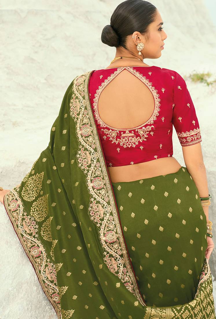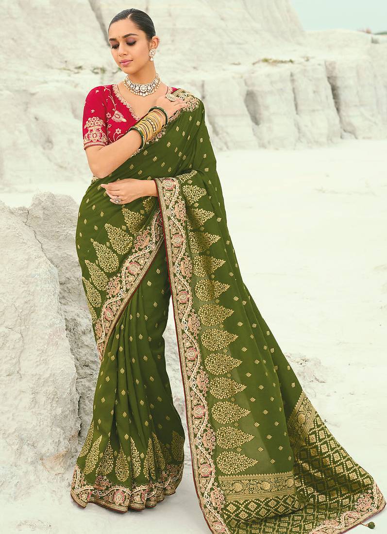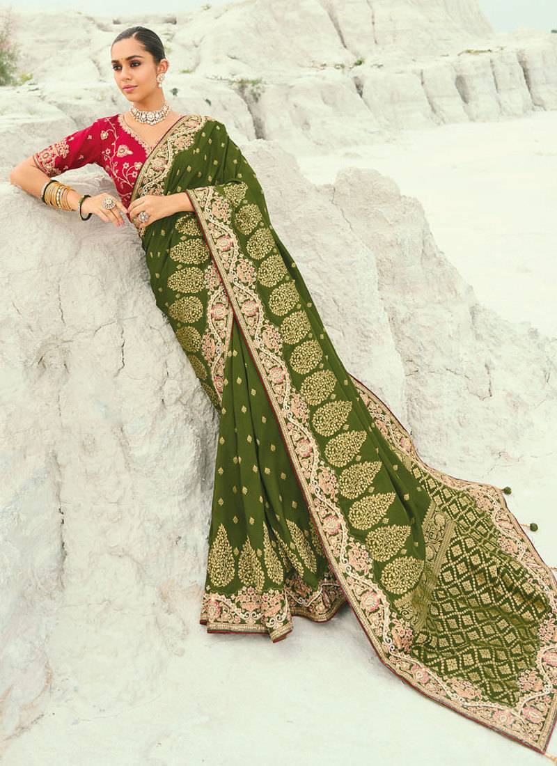 | Product Name | Mehendi Dola Viscose Jari, Thread, Moti With Cut Dana Heavy Work Saree With Blouse | |