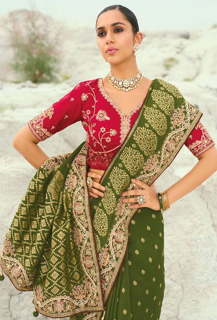 | Product Description | Saree Fabric: Pure Dola Viscose, Saree Color: Mehendi, Blouse Fabric: Pure Silk, Blouse Color: Red, Work: Jari, Thread, Moti With Cut Dana Heavy Work, Remark: Saree With Blouse |